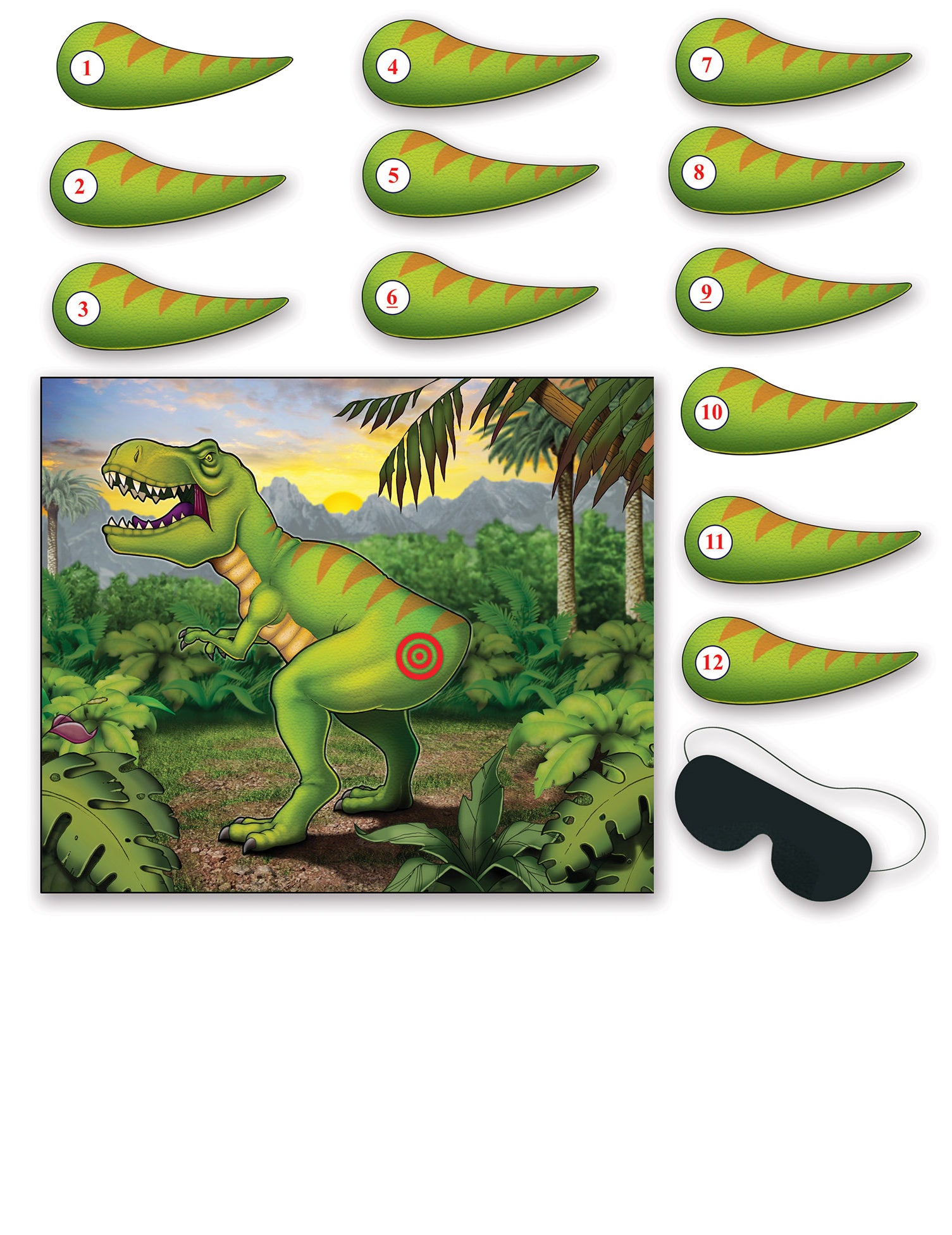 Ta sklop igre je sestavljen iz plakata, vključenih 12 repov in 1 maske. Ta plakat je na temi dinozavrov. Meri približno 56 cm širok x 46 cm. Cilj igre je postaviti masko in postaviti rep dinozavra na načrtovano lokacijo. Ta animacija bo kot nalašč za rojstni dan ali zabavo na temo dinozavrov!