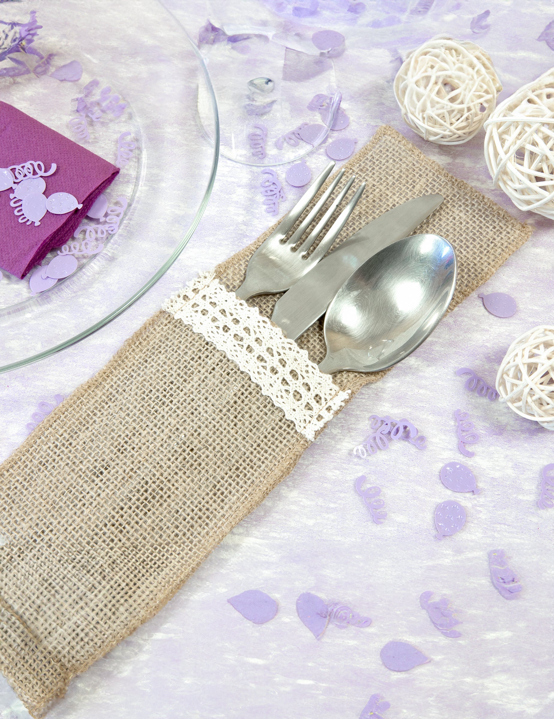 Dodajte svojemu sprejemu pridih naravne elegance s tem kompletom 4 kosov držalo za jedilni priborTi dodatki, podobni juti, merijo 8,5 x 24,5 cm in so okrašene z nežno belo čipko za eleganten videz romantično in izpopolnjeni. Popolni bodo za zaključek dekoracija tvojega podeželska poroka ali zabavo s pristnim šarmom.