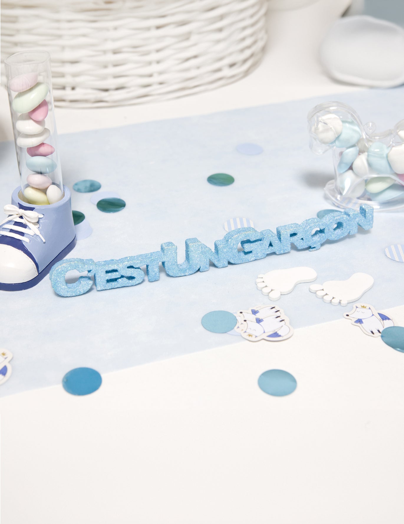 S tem dodajte svojemu dogodku bleščeč pridih dekoracija mize Modra in okrašena z bleščicami. Izdelana je iz polistirena in ponosno razkazuje sporočilo "Fant je", da proslavi prihod vašega otroka. Njene dimenzije so 21 x 2,5 x 0,9 cm. cm, to dekoracija mize eleganten bo poudaril vaše otroška zabava ali vaš praznovanje rojstnega dne !