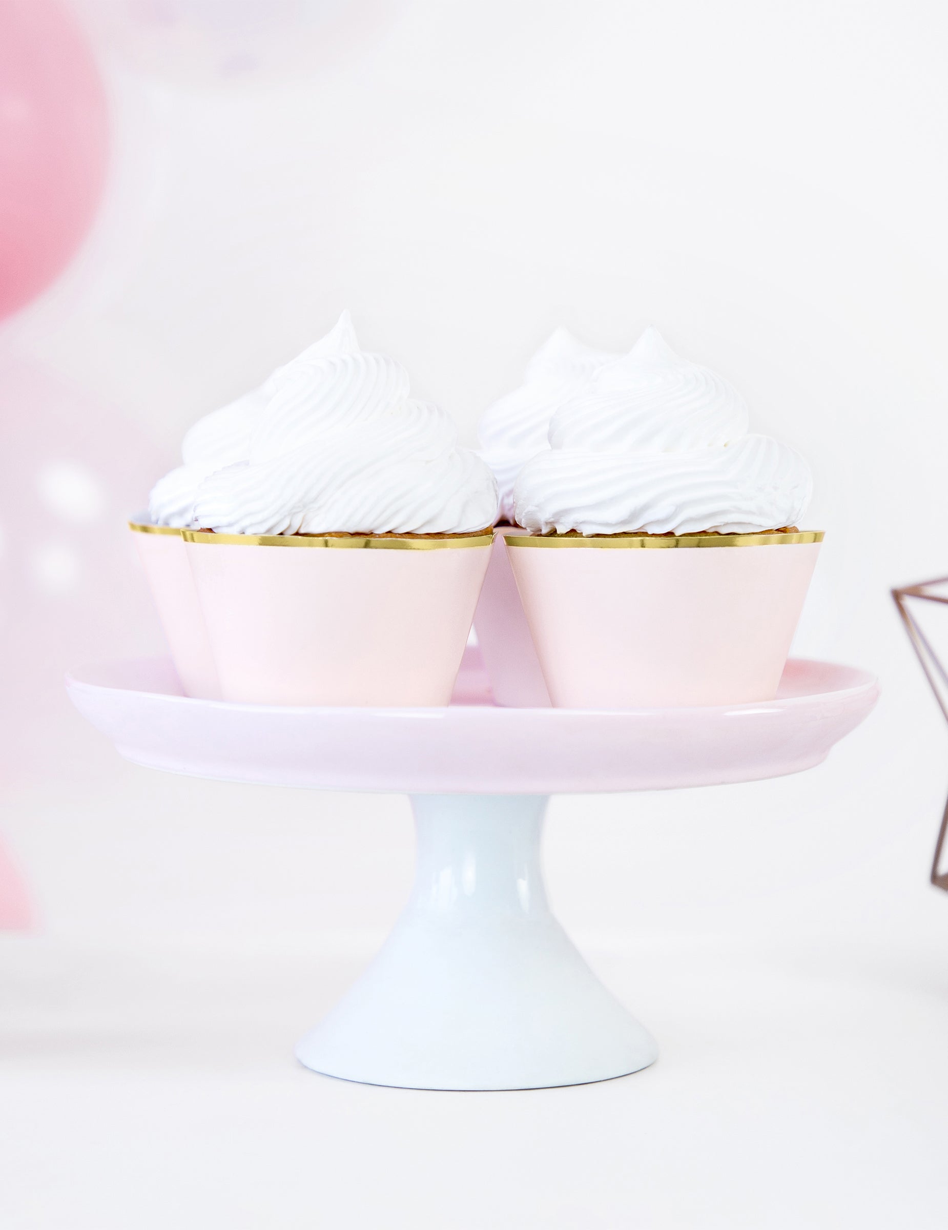 Z nežnim pudrasto rožnatim odtenkom, poudarjenim s kovinsko zlato obrobo, podstavki za kolačke Vaši mizi dodajo pridih elegance. Visoki so 4,8 metra. cm, zgornji premer 7,6 cm in osnovo 4,6 cm.