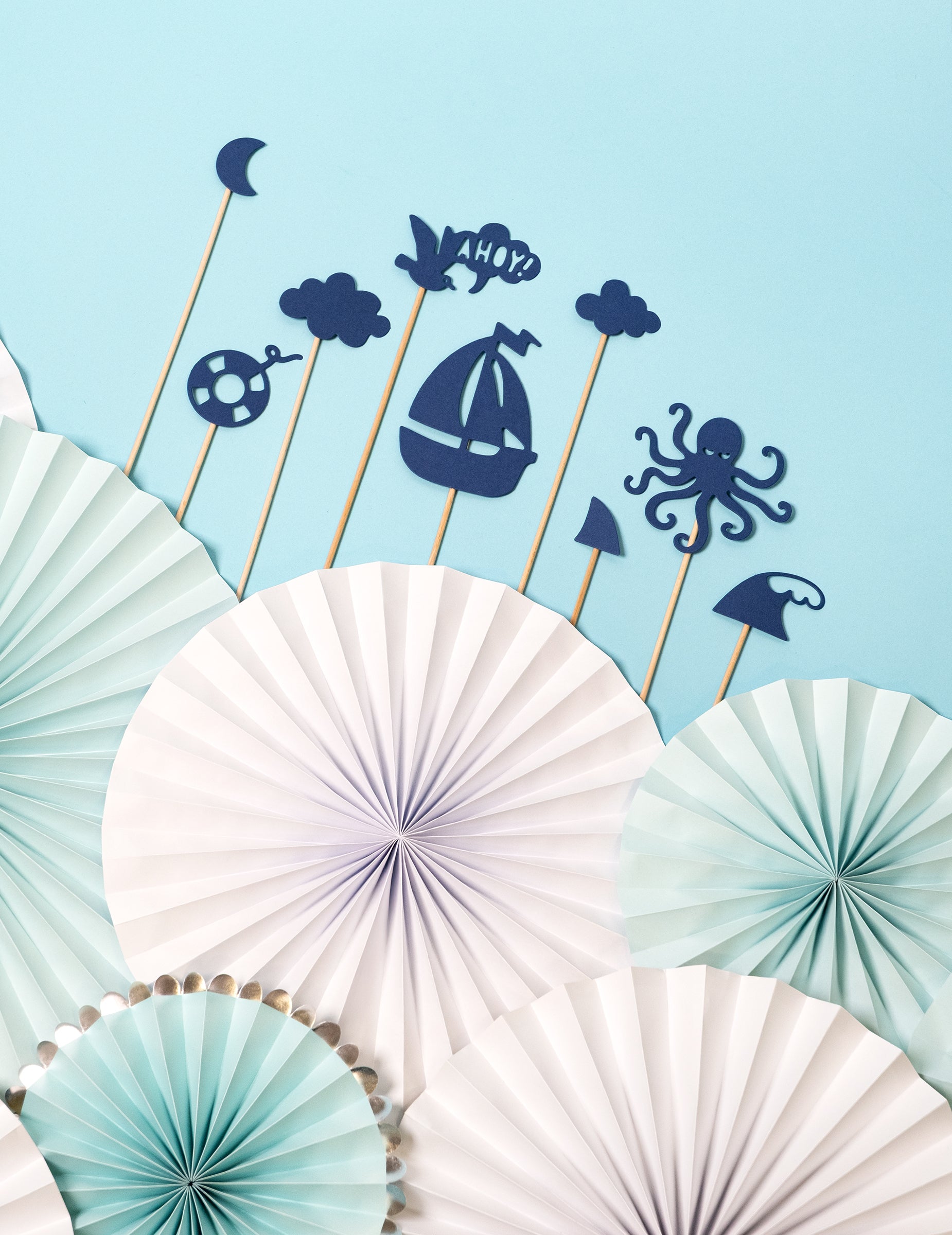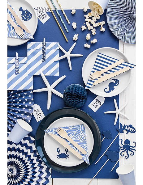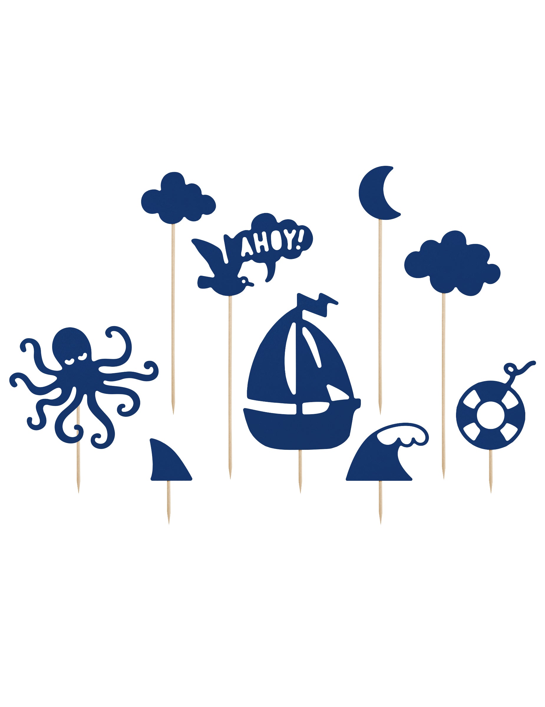 Dodajte svojim kreacijam pridih oceana s tem kompletom 9 kosov okraski za torte nameščene na steblih. Te majhni dodatki Temno modre so na voljo v velikostih od 9,5 do 22,5 cm. Zbirka vključuje različne ilustrirane predmete, kot so hobotnica, čoln, boja, morska plavut in polmesec. Za personalizacijo torta na morska temaTe konice so idealna izbira. Popolne bodo za navtični rojstni dan, od poroka na morju ali praznovati fant za otroško zabavo.