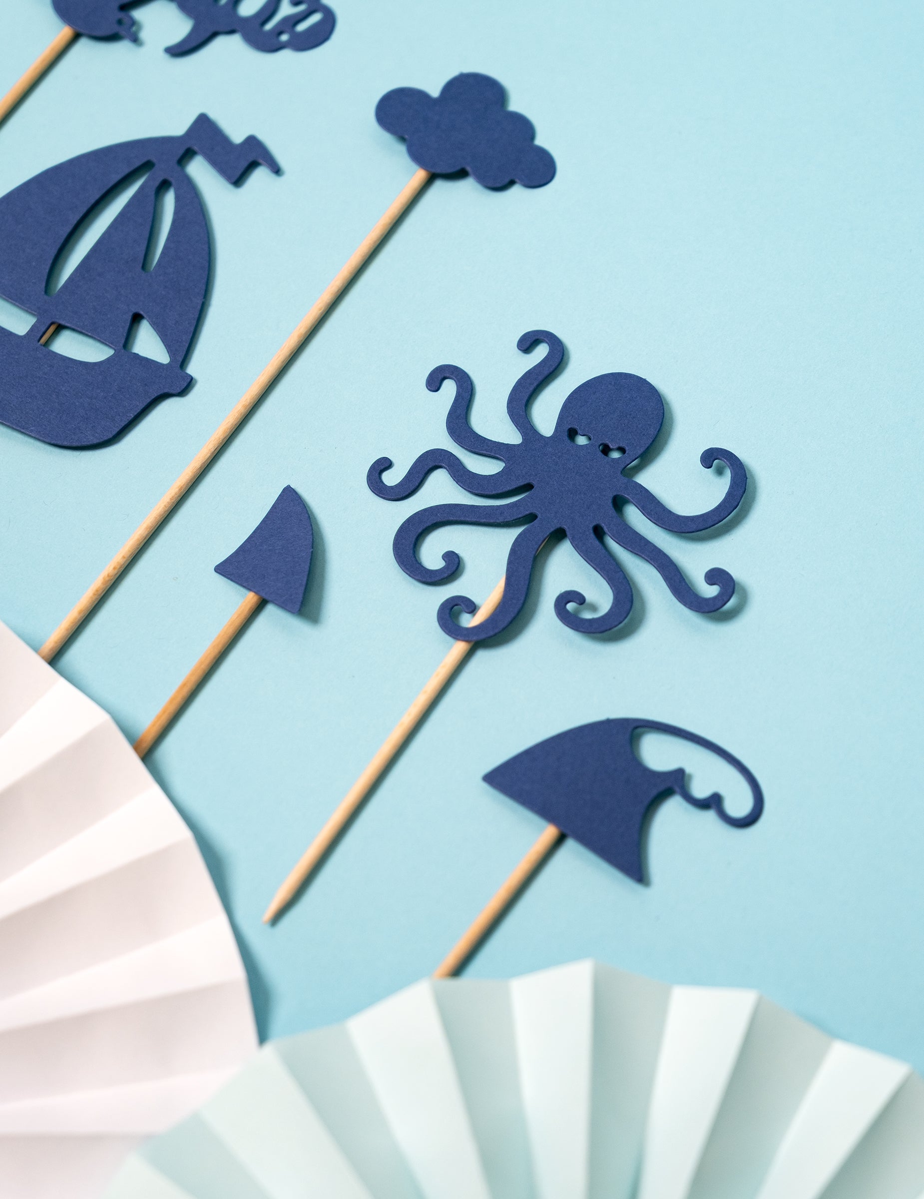 9 temno modrih okraskov za torte na palčkah, 9,5 do 22,5 cm cm morski motivi