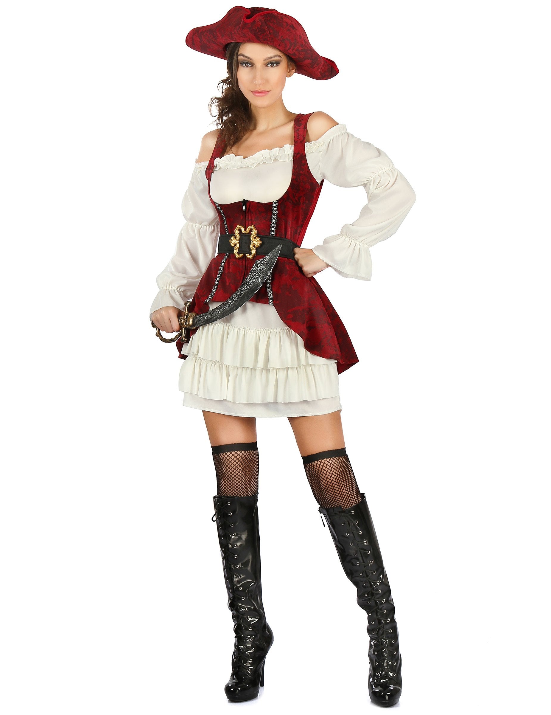 Ta seksi gusarska preobleka vključuje obleko, telovnik, klobuk in pas. Obleka Froufrous je kratka in bela z zabuhlimi rokavi. Rdeči jopič s tankimi in dolgimi vzmetniki zadaj je okrašen z baročnimi vzorci. Ujemajoč se kapo Tricorne in pas, da bi izpopolnili celotno, udobno in prilagodljivo svoji silhueti. Ta piratski kostum za ženske je zelo estetski in kot nalašč za karneval ali zabavo, prikrito na temo piratstva.