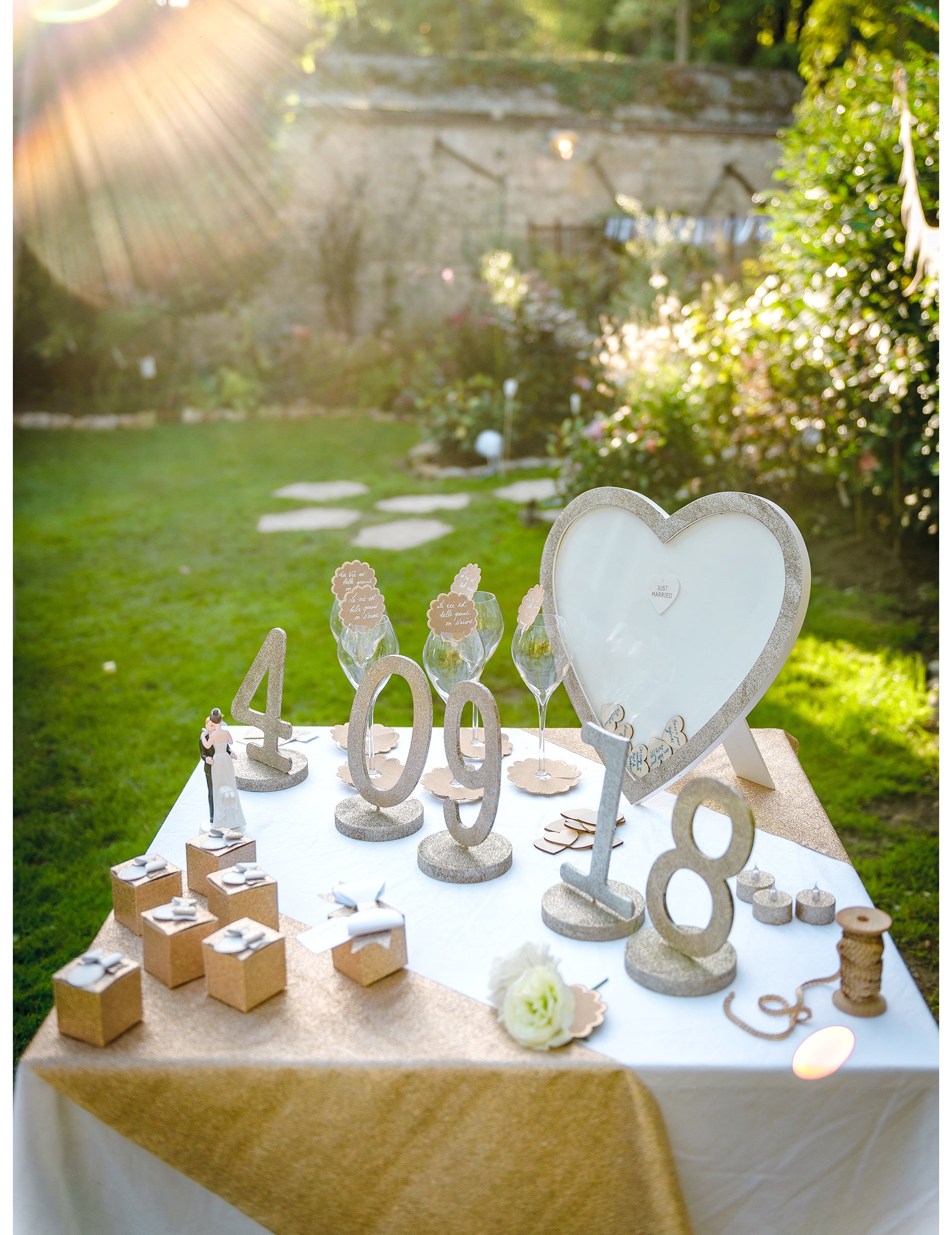 Komplet ima romantičen dizajn v obliki srca z bleščečim bakrenim zaključkom. Osrednji beli medaljon prikazuje sporočilo »Pravkar poročena«, ki slavi vajino zvezo.
