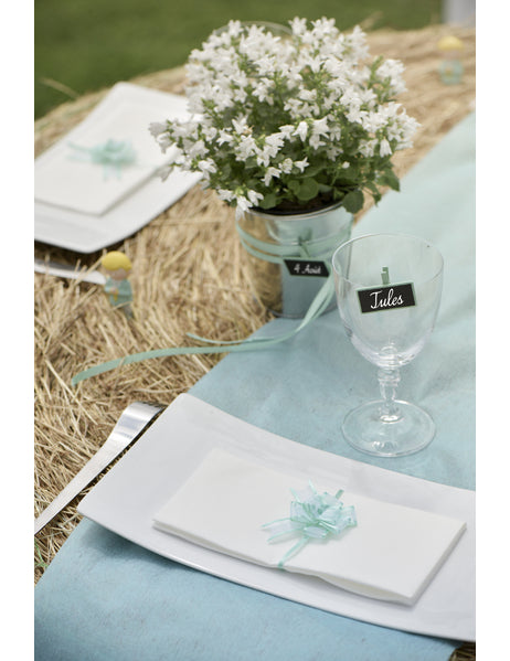 Ta komplet vsebuje 5 mini turkizne pentlje Elegantne za vaša praznovanja. Izdelane iz satenastega organdija v živahni modri barvi, te majhni vozli Izdelani so iz 16 mm širokega traku. Oblikovanje je zelo preprosto: samo povlecite za dve vrvici na hrbtni strani, kar vam omogoča tudi enostavno pritrditev na izbrano površino. Ti dodatki so idealni za okrasitev mize, škatel za darila ali kot originalni obročki za prtičke. Dodajte kanček lahkotnosti svojemu poročna dekoracija ali krst s temi nežnimi okraski iz organdija.