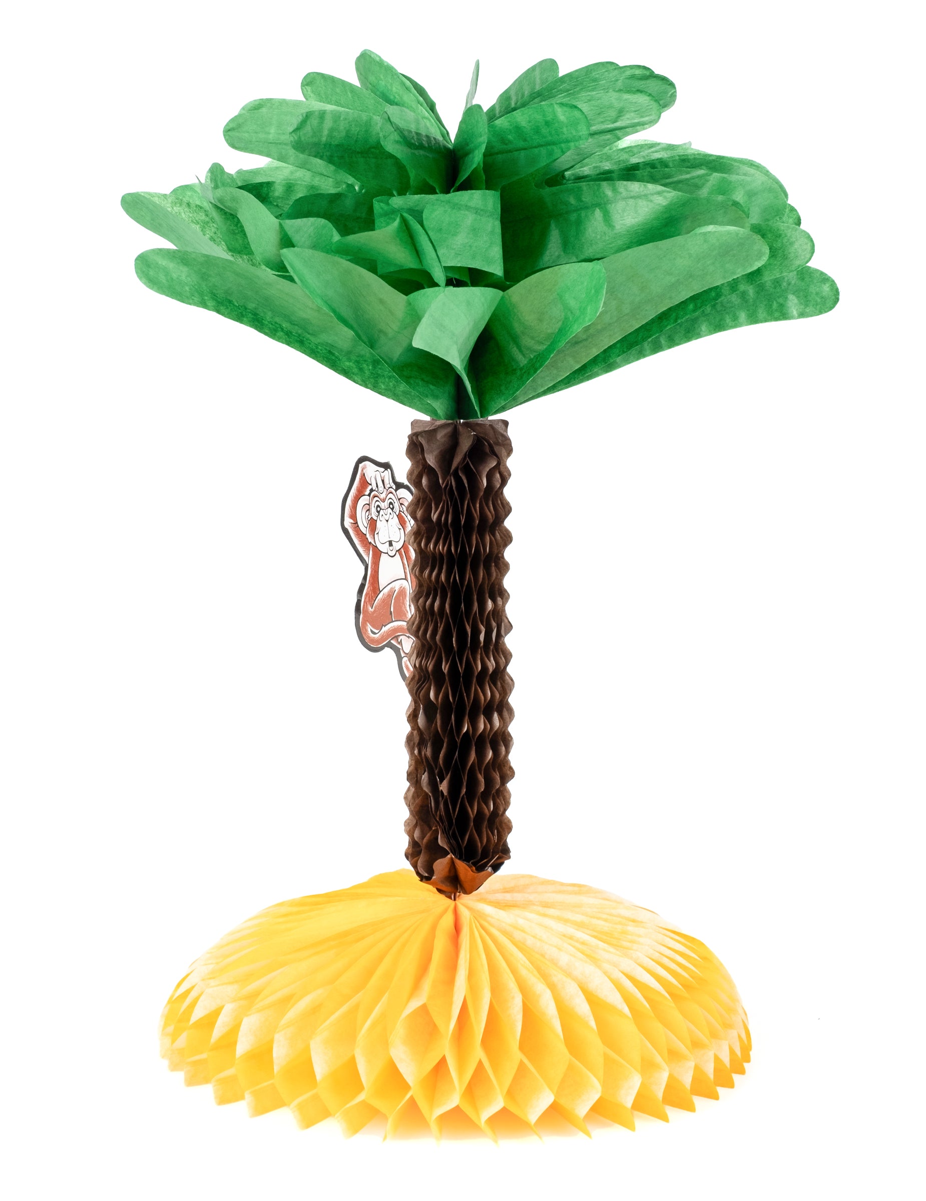 Apportez une touche d'exotisme à votre décoration avec ce centre de table en papier alvéolé en forme de palmier. D'une hauteur de 33 cm, il dispose d'un socle jaune imitant le sable et d'un petit singe malicieux fixé sur le tronc. Ce centre de table est l'accessoire parfait pour animer une fête sur le thème Hawaï ou une réception tropicale.