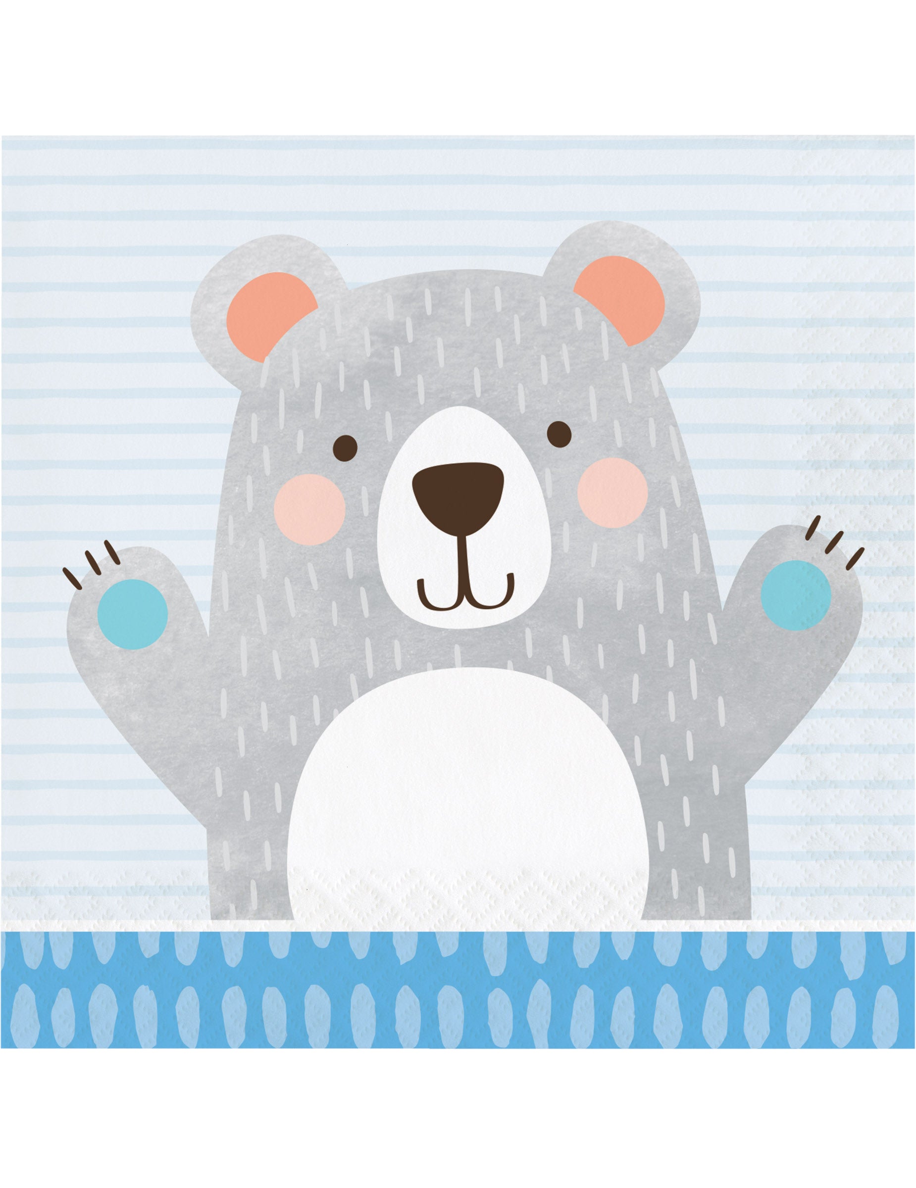 Ta sklop ima 16 papirnatih brisač, ki merijo 16,5 x 16,5 cm zložene in 33 x 33 cm, ko se enkrat odvije. Te brisače so okrašene s precej majhnim sivim medvedom. Dno je svetlo sivo s črtami, dno brisač pa modro. S temi brisačami bo uspeh vaša rojstnodnevna zabava ali otroški tuš.