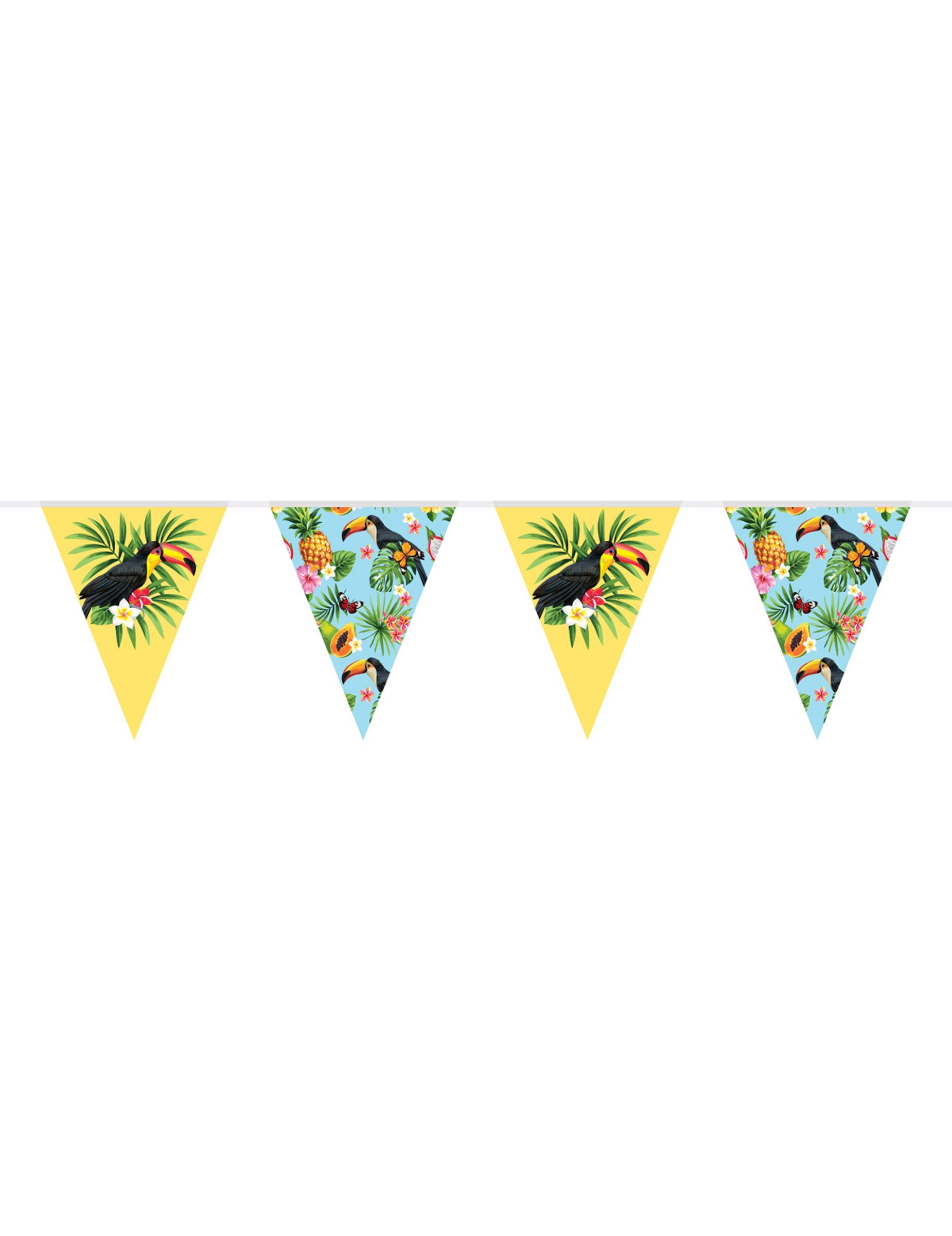 S tem dodajte svojemu dogodku kanček barve venček iz tukana Izdelana je iz trpežne plastike. S skupno dolžino 10 metrov ima izmenično rumene zastavice, ki prikazujejo veliko tukan v osrčju džungle in turkizne zastavice, ponazorjene z tropsko cvetje in odananas sladko. To tropski venec je nepogrešljiv dodatek za okrasitev zabave na prostem ali v zaprtih prostorih, ki se popolnoma prilega tropska tema Ali eksotično.