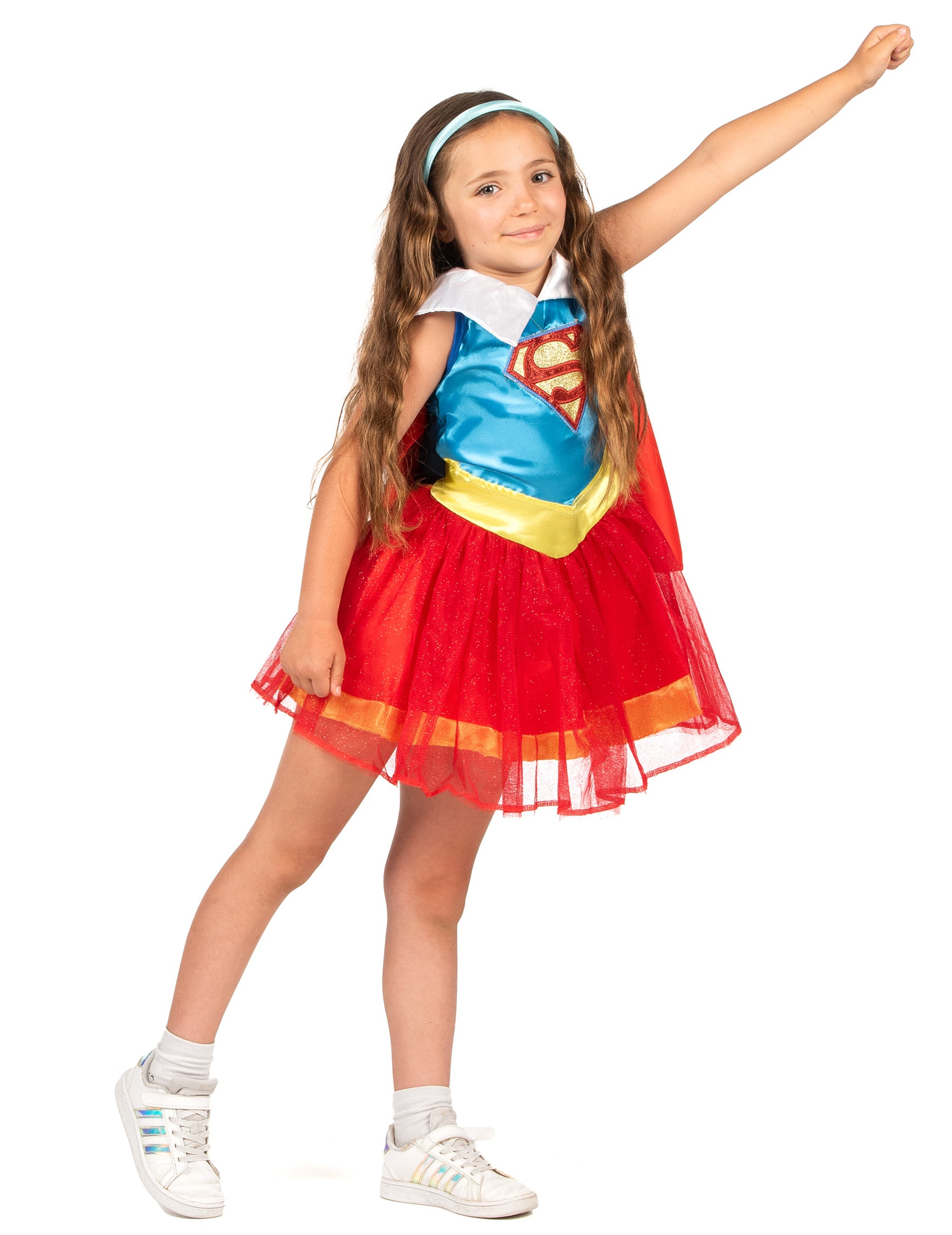 Ta kostum Supergirl je uradno licenciran DC Super Hero Girls. Odlikuje ga obleka z ogrinjalom in trakom za glavo. Trak za glavo je svetlo modre barve. Kot nalašč za nošenje na glavi! Kratka obleka brez rokavov je satena modra na doprsju z logotipom bleščic Superman in Supergirl na sredini prsnega koša. Na obleko je prišit beli ovratnik, prav tako tudi kratek rdeč ogrinjalo. Imitacijski rumeni pas v obliki črke V obleko je tudi prišit. Končno je dno obleke bleščeč rdeči til tutu, obložen z rdečo tkaninsko krilo, obkroženo s trakom rumene tkanine. Ta kostum Supergirl, superheroj iz DC Super Hero Girls, bo hčerko navdušil med karnevalom ali rojstnodnevno zabavo s superherojem.
