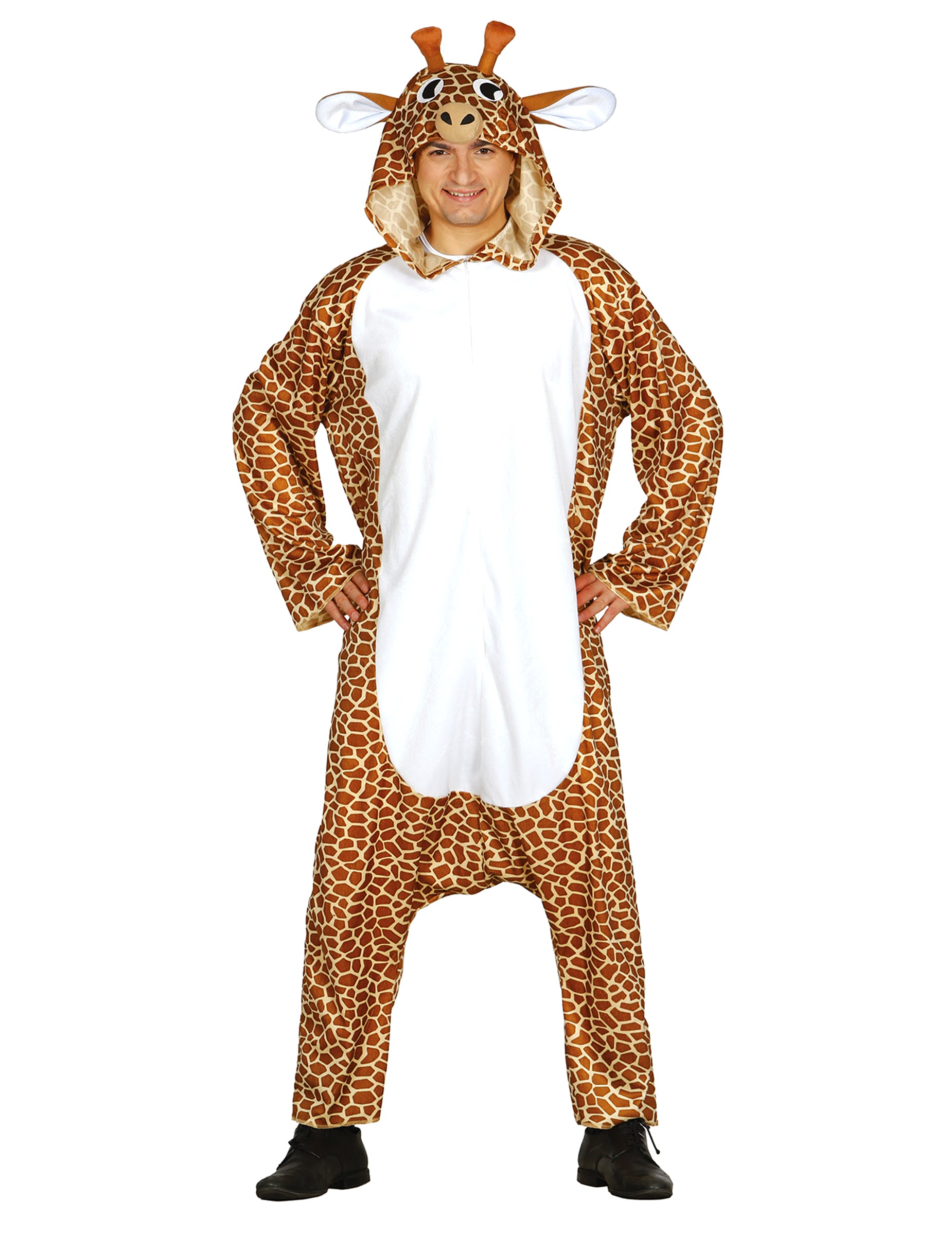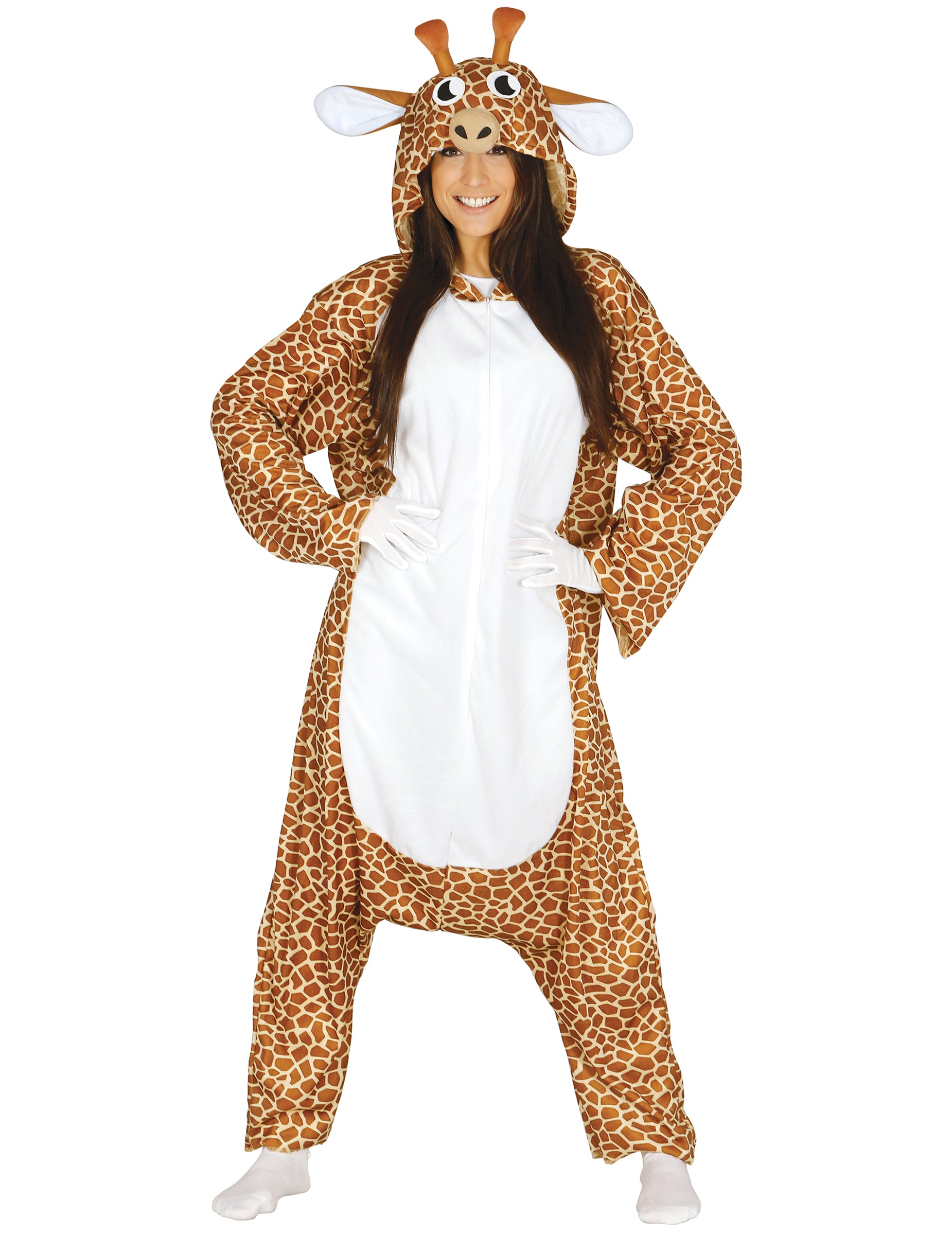 Ta kostum za odrasle žirafe je kombinacija s kapuco. Ta široka kombinacija je natisnjena s plaščem žiraf z belim trebuhom. Opremljen je z zadrgo na sprednji strani, da jo postavi in zlahka zapre. Prav tako ima kapuco, ki jo je zavzela glava žirafe za predpostavljen živali! Ta kostum žirafe bo kot nalašč za tematski večer živali ali humorja!
