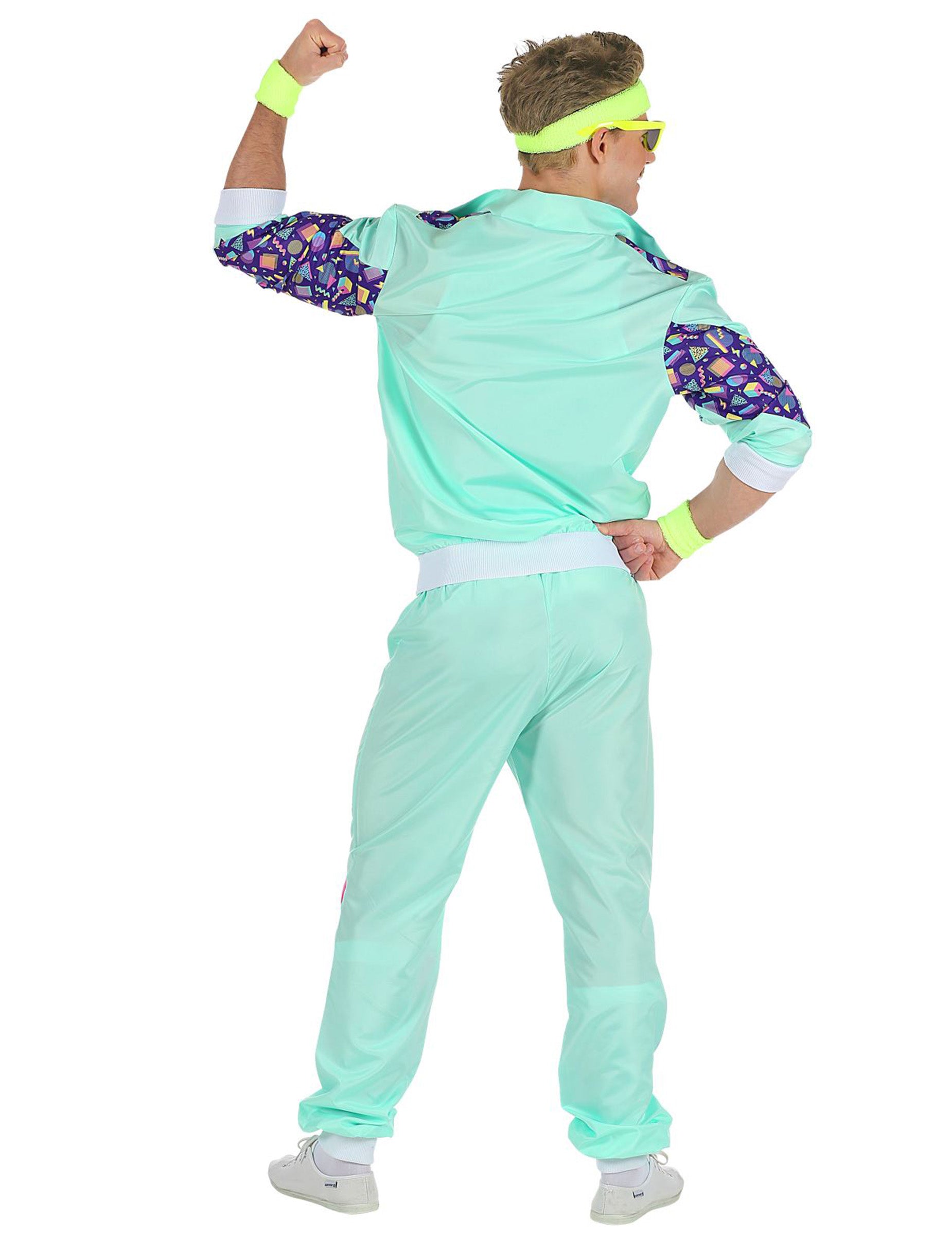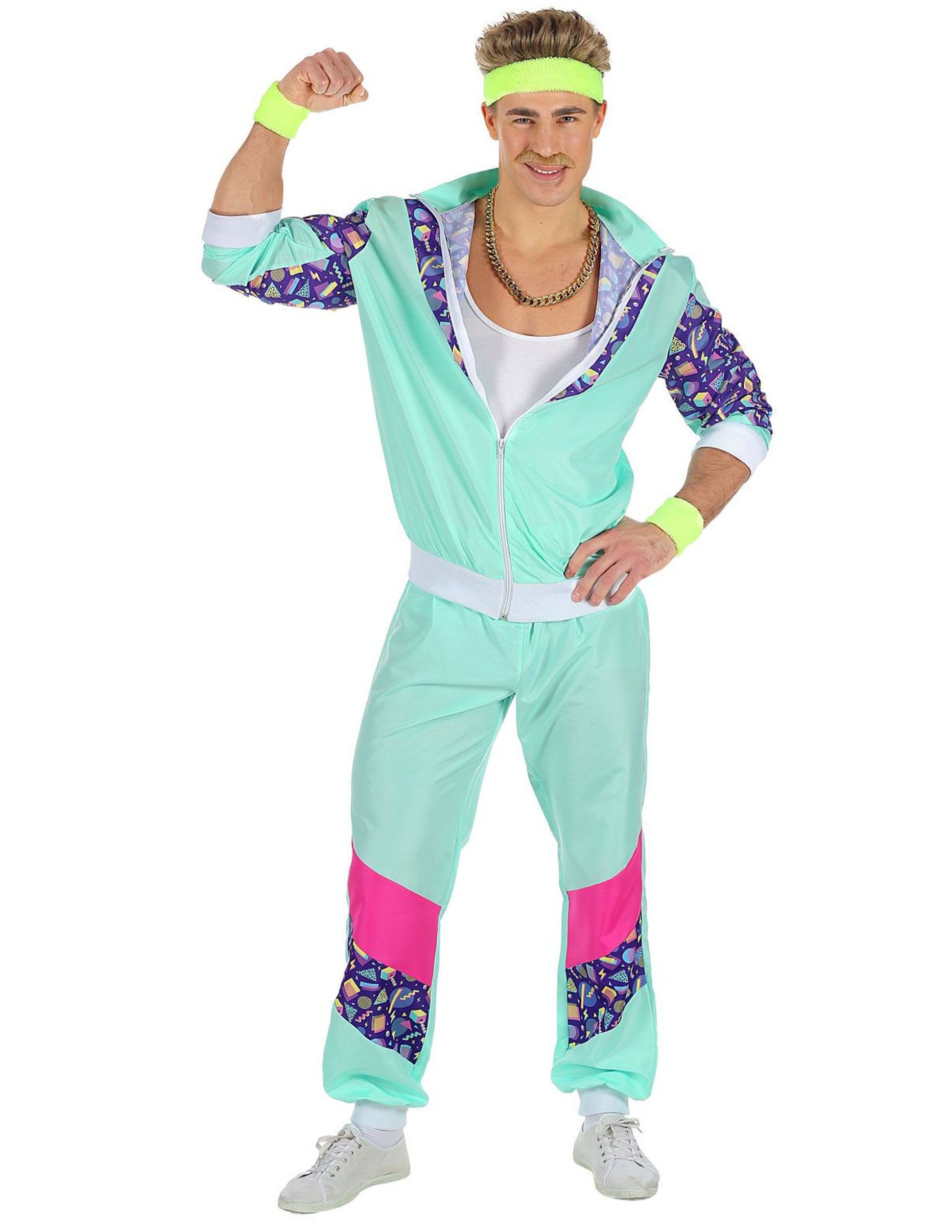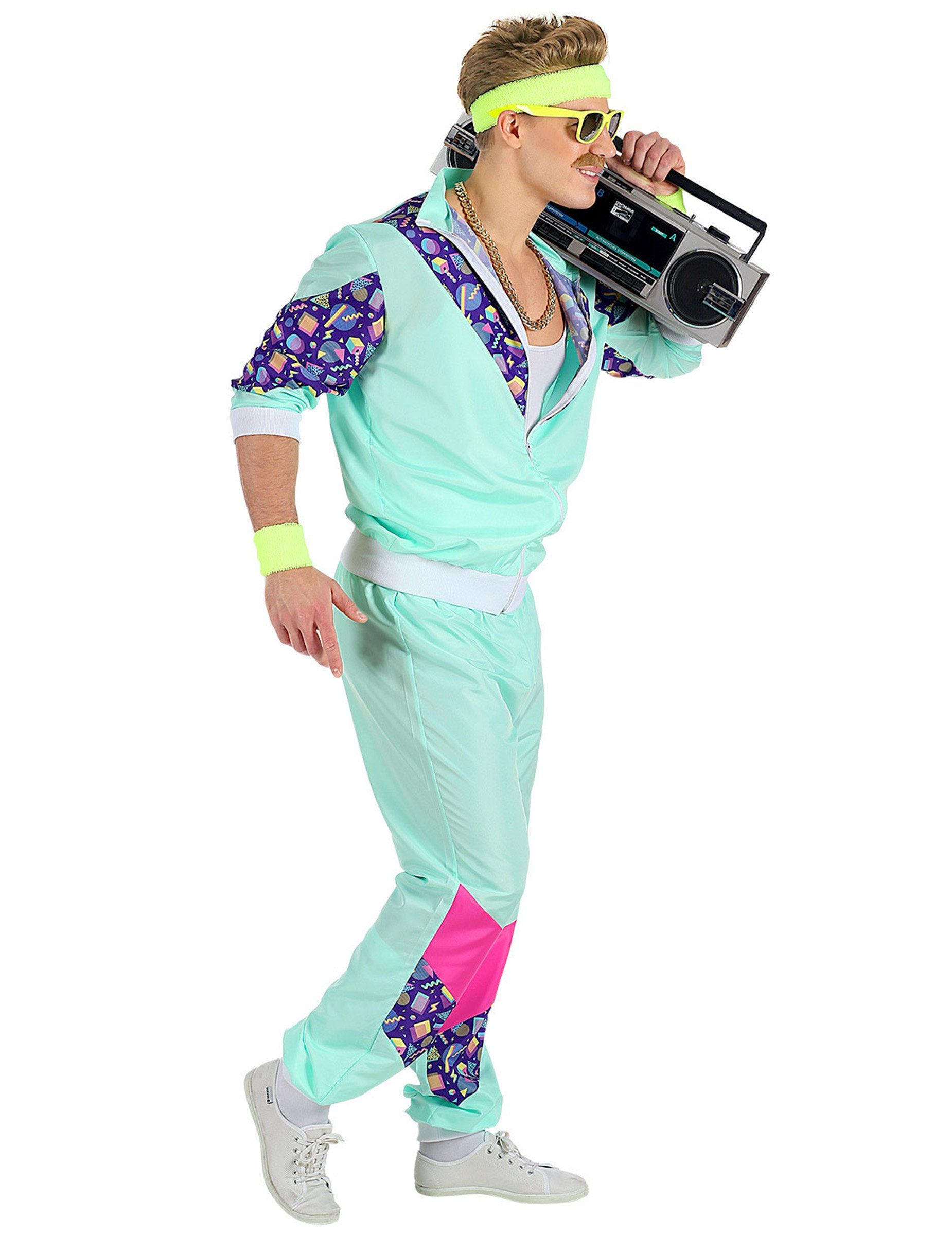 Ta kostum iz 80 -ih za moške je sestavljen iz suknjiča in hlač. Telovnik je svetlo modra je 80 -ih odtisov v rokah in prsih. Zapre se z zadrgo. Dno je tudi nebesno modro, z roza pasovi in ​​retro odtisi. Ta kostum bo kot nalašč za malo potovanja v 80. letih v retro večeru.