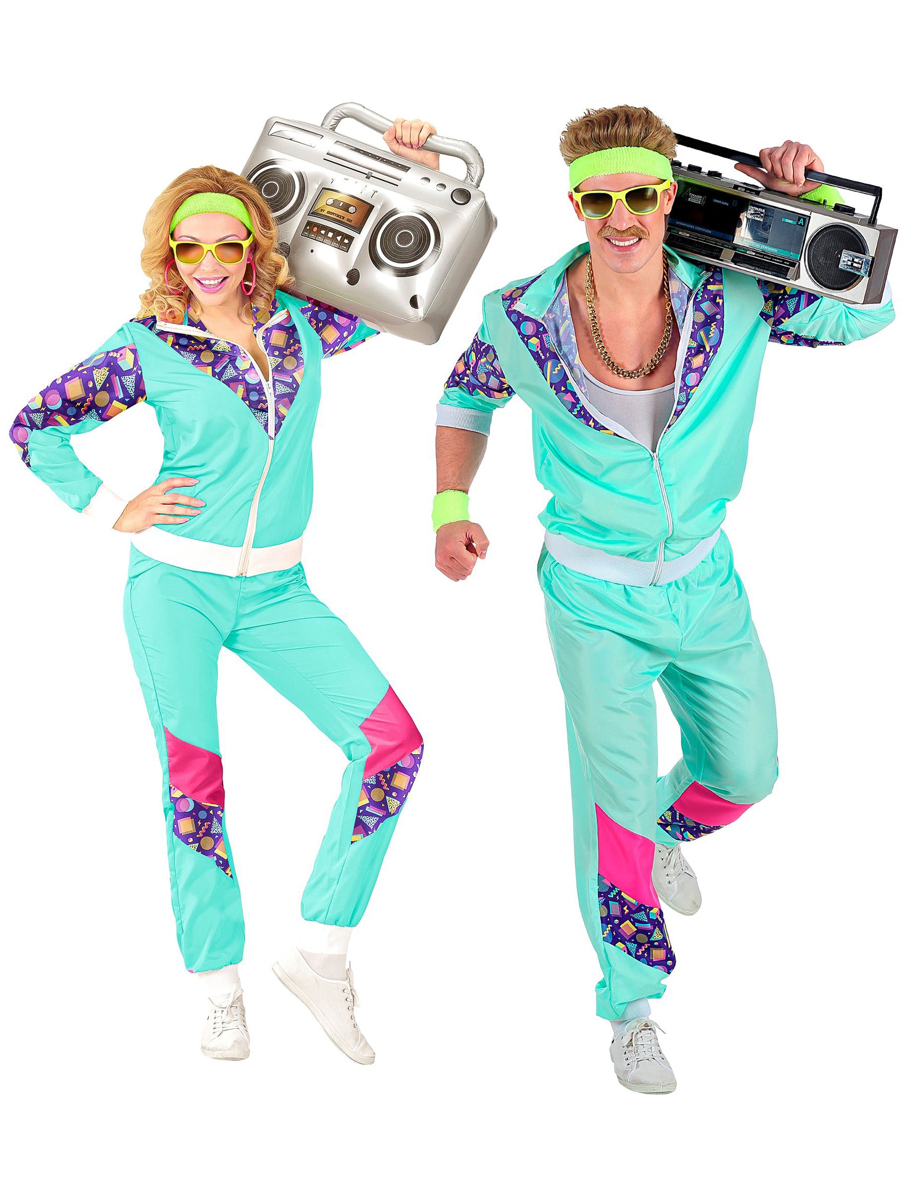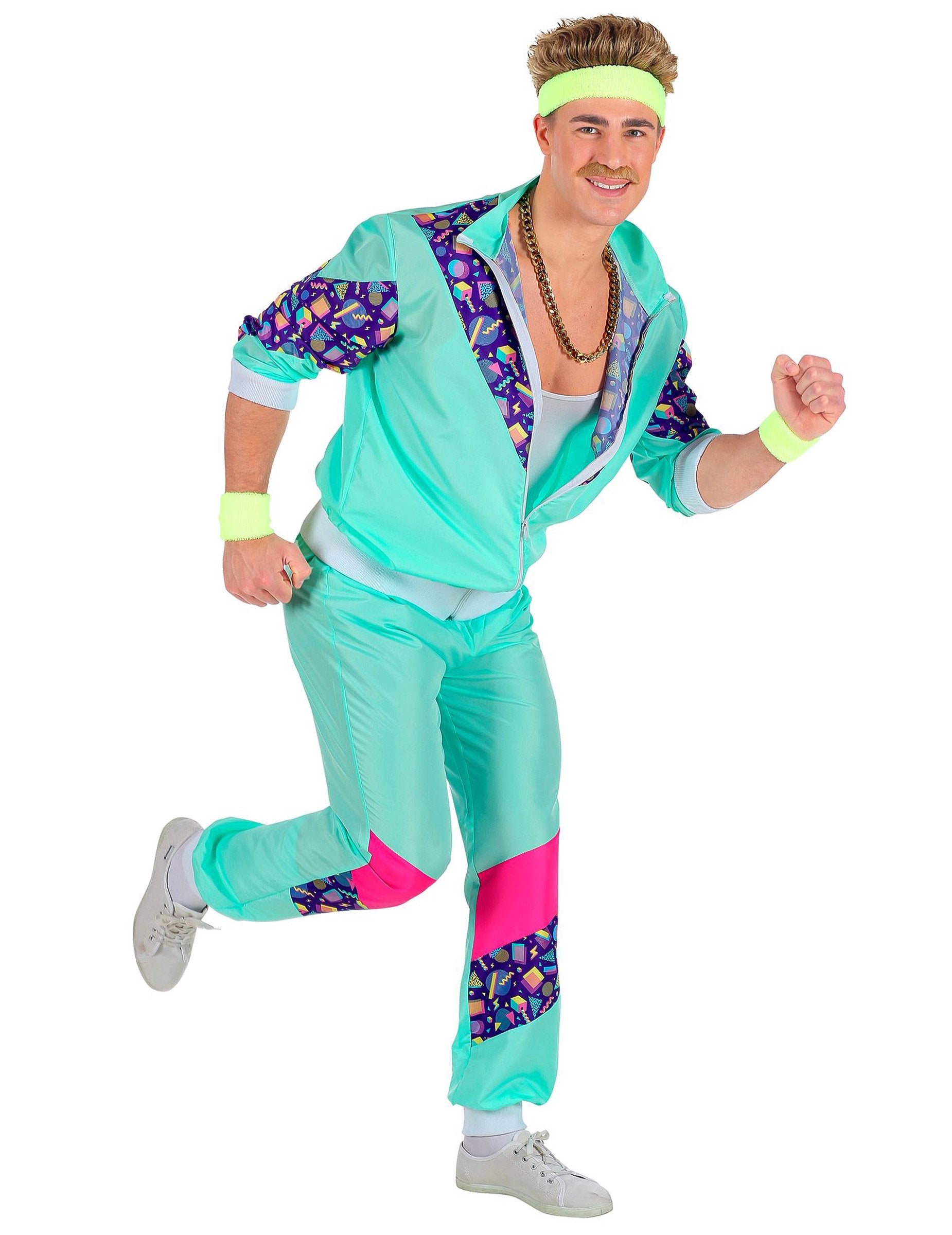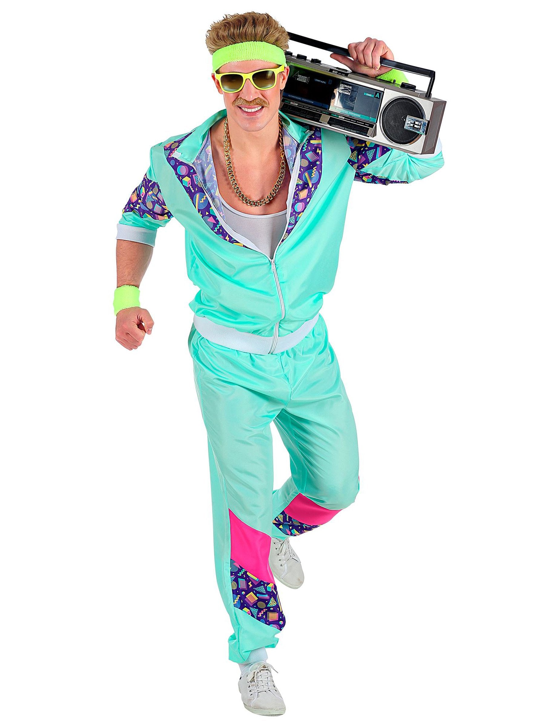 Ta kostum iz 80 -ih za moške je sestavljen iz suknjiča in hlač. Telovnik je svetlo modra je 80 -ih odtisov v rokah in prsih. Zapre se z zadrgo. Dno je tudi nebesno modro, z roza pasovi in ​​retro odtisi. Ta kostum bo kot nalašč za malo potovanja v 80. letih v retro večeru.