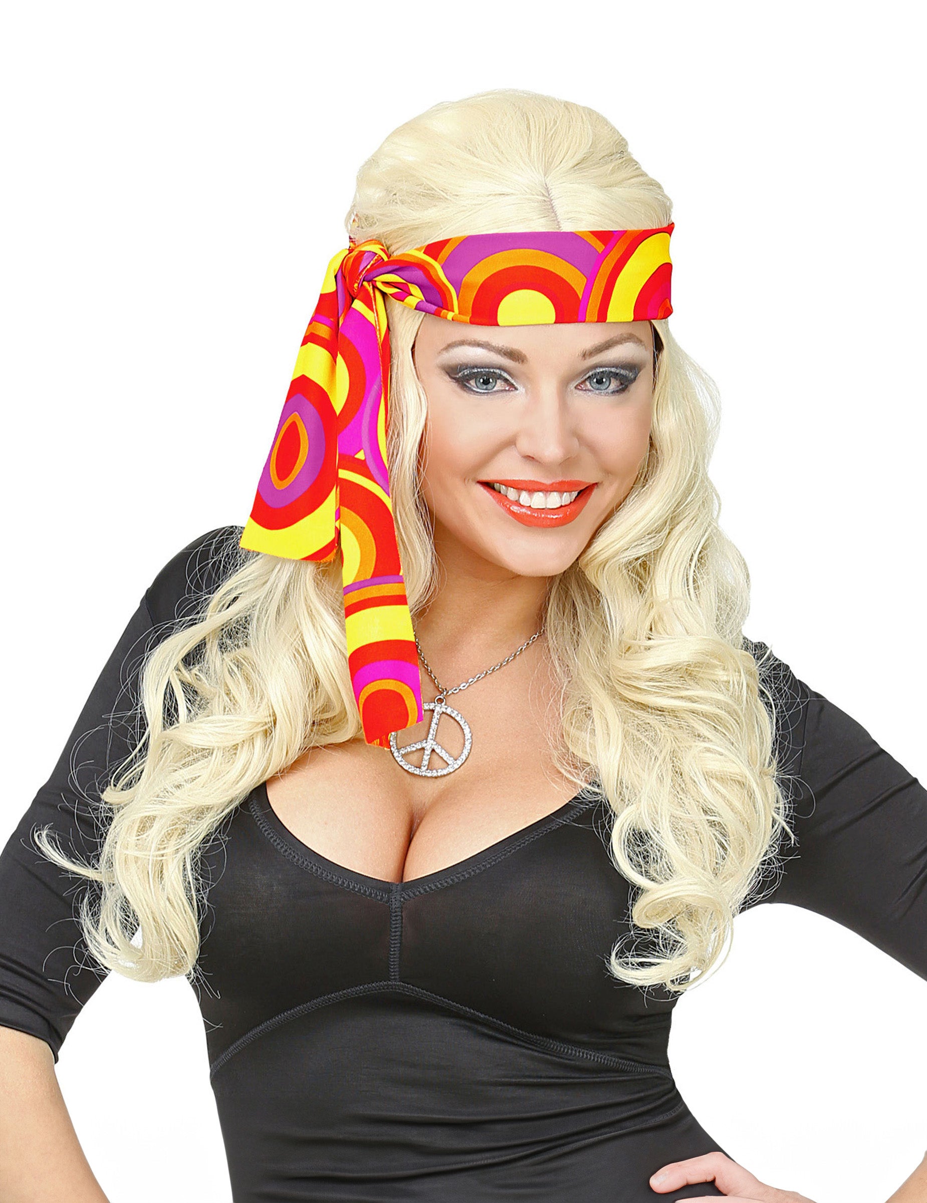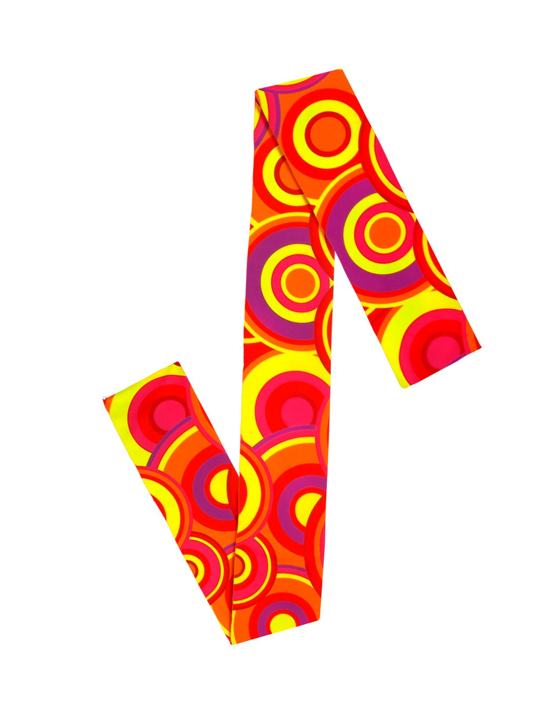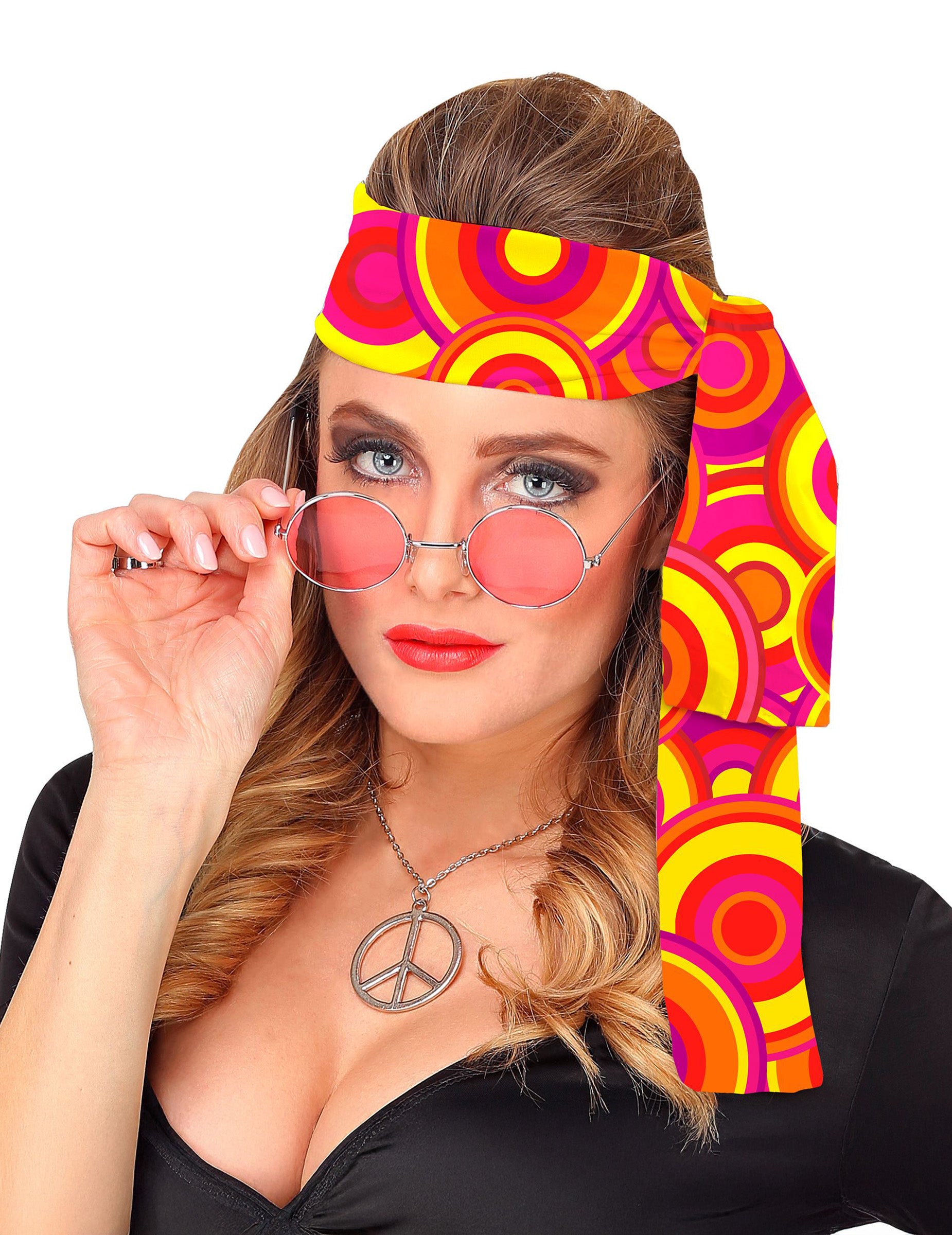 Ta 70 -ih za žensko pasico je narejena v tkanini z okroglimi vzorci, rumenimi, oranžnimi, rdečimi, rdečimi in vijoličnimi. Preprosto veže okoli glave. Ta transparent bo kot nalašč za dokončanje disco preobleke ob karnevalu ali večeru v 70. letih.
