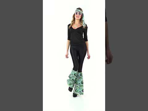 Ta komplet za ženske iz 70 -ih je sestavljen iz trakove za glavo in par gamaše (vključeni so samo ti elementi). Celotna je narejena v tkanini z valovnim tiskom, v tonih zelenih, modrih, črno -belih. Treba je preprosto privezana okoli glave. Gamaše so rahlo razgibane in elastične, da se dobro vzdržujejo. Ti dodatki bodo kot nalašč za dokončanje vašega hipi ali disko kostuma za karneval.