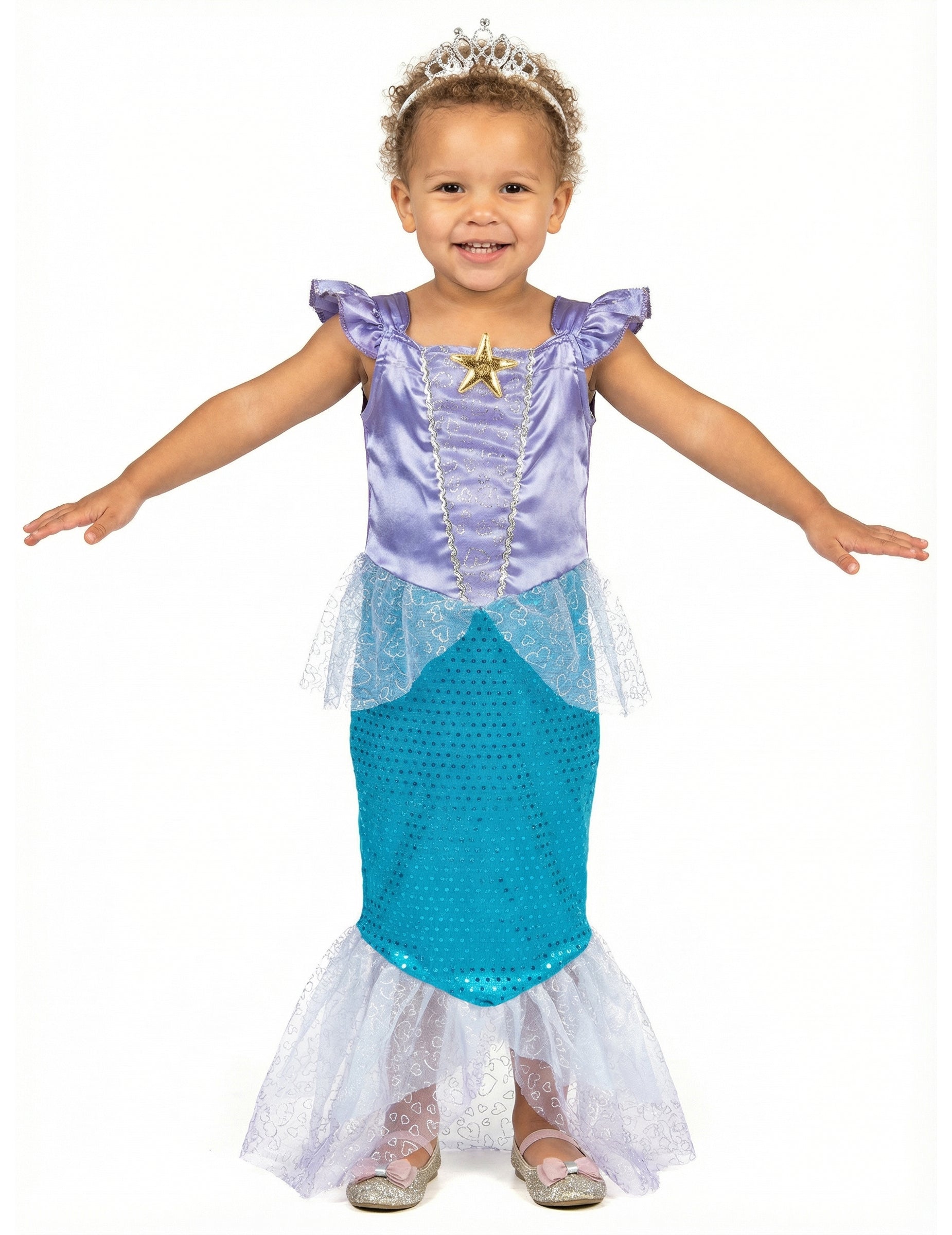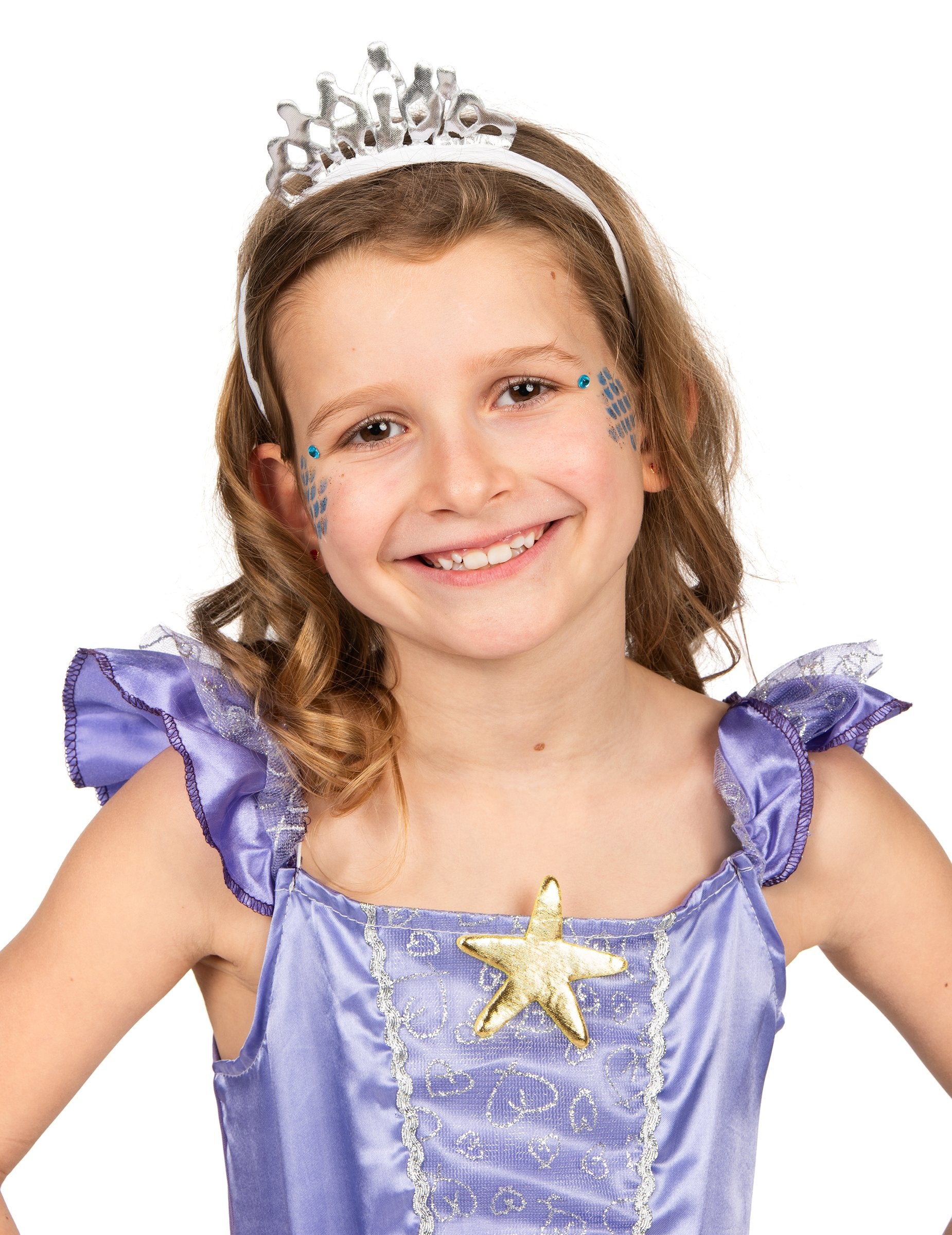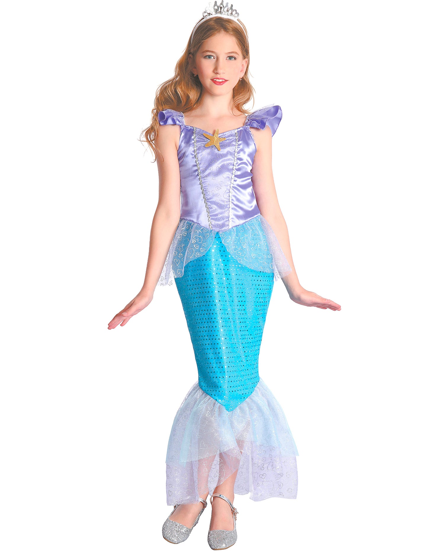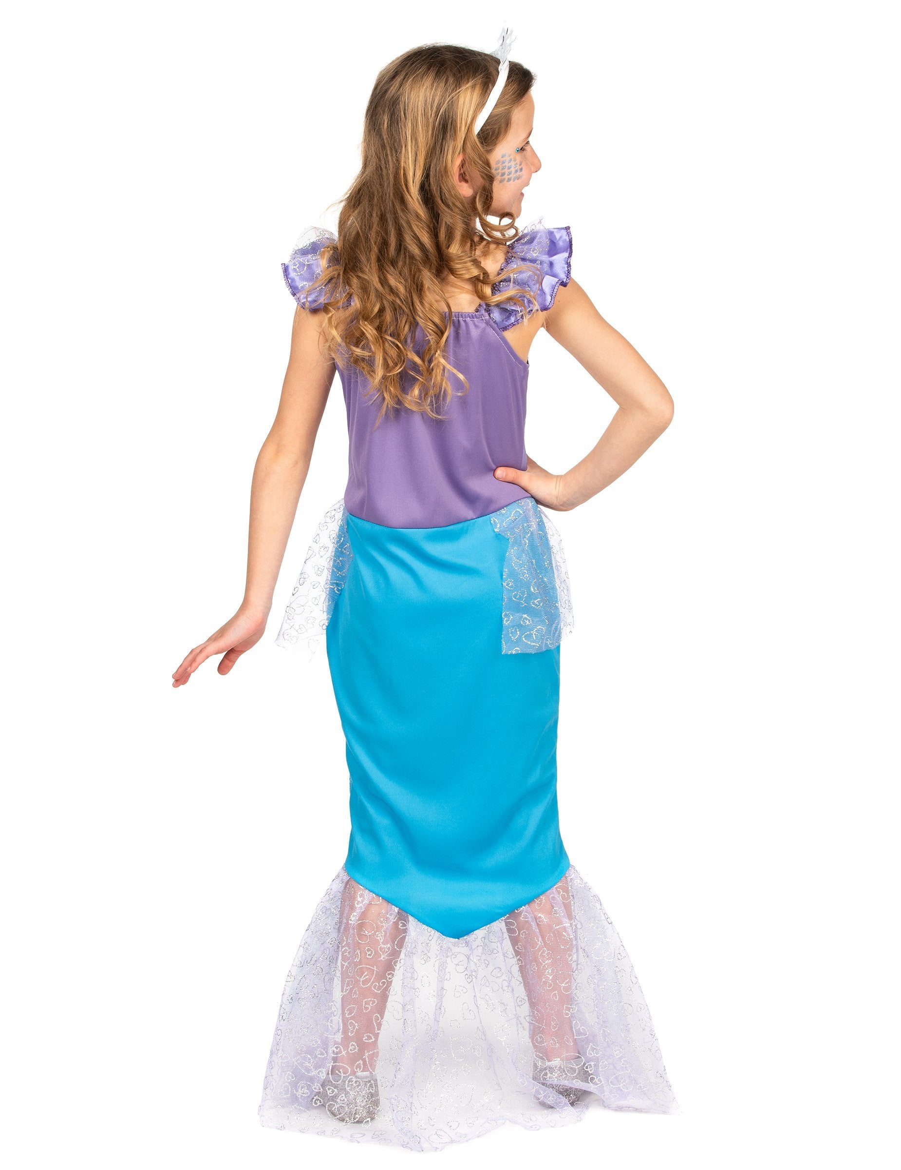 Ta kostum sirene sirene je sestavljen iz obleke in glavnega rastlinjaka. Obleka je dolga in predstavlja telo morske deklice z nogami, ki tvorijo ribjo ploščo. Vrh je saten vijoličen, dno je turkizno modro sijoč, da posnema ribje luske, na dnu obleke pa ima jadra iz tila, da posnema plavuti ribe. Glavni rastlinjak je srebrna krona, ki bo popolnoma dokončala ta kostum. Ta kostum Mermaid bo popoln med prikritjem večerom ali za karneval!