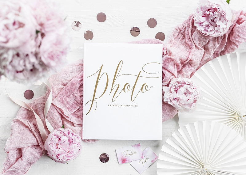 Skrbno shranite svoje spomine s tem foto albumom velikosti 20 x 24,5 cm. Z elegantno belo platnico in zlatim napisom "Photo precious moments" doda prefinjen pridih vašim spominom. Ta album ponuja 22 strani, namenjenih vašim najlepšim fotografijam. Je popoln dodatek za ovekovečenje vsakega trenutka vašega poročne slike.