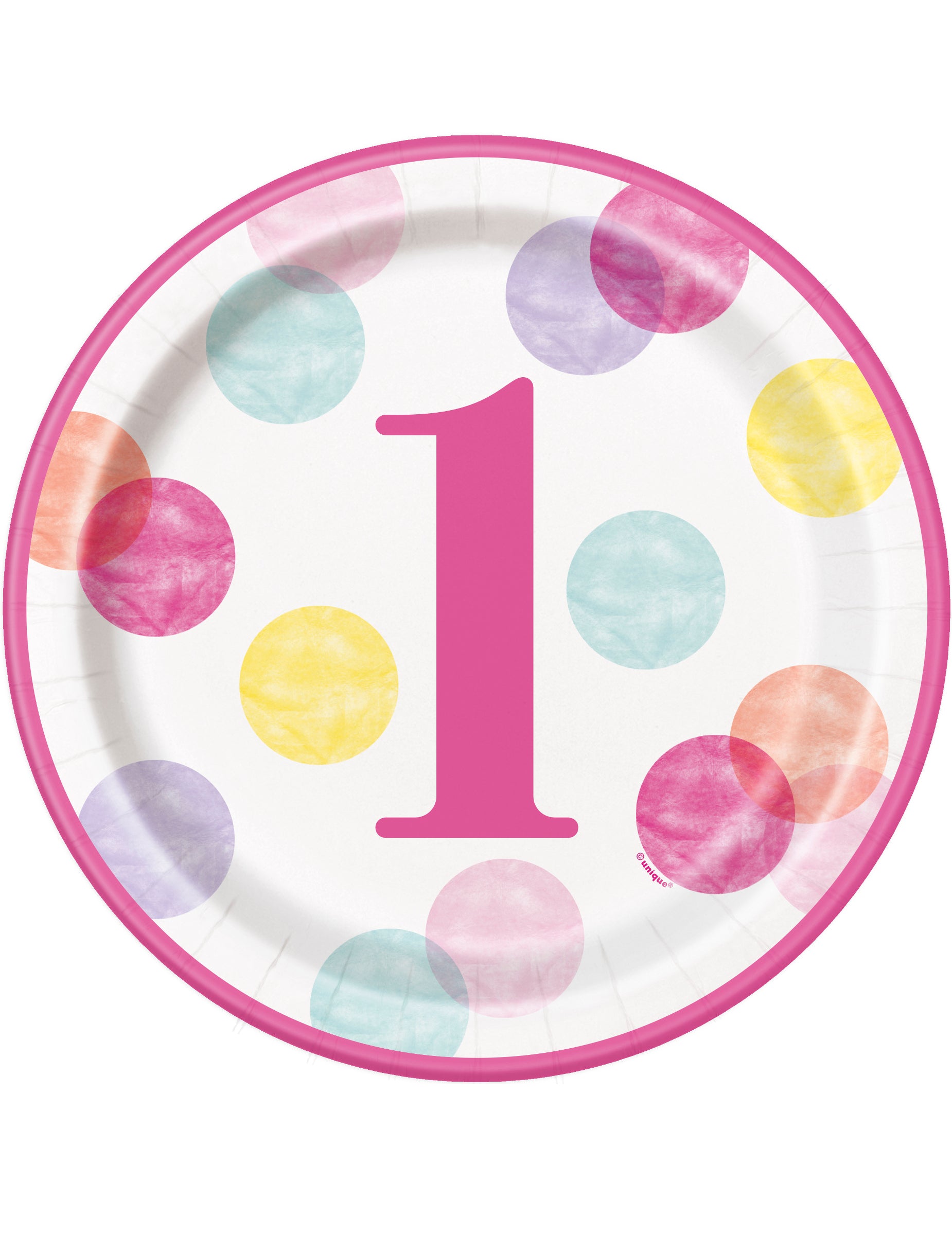 Ta sklop vključuje 8 krožniki Krožniki za enkratno uporabo iz trpežnega kartona. Vsak krožnik meri približno 23 cm v premeru. Z elegantnim belo-roza dizajnom so okrašeni z barvitimi pikami in številko 1 na sredini. Ti krožniki bo idealen za popestritev mize med prva obletnica tvoje male deklice.