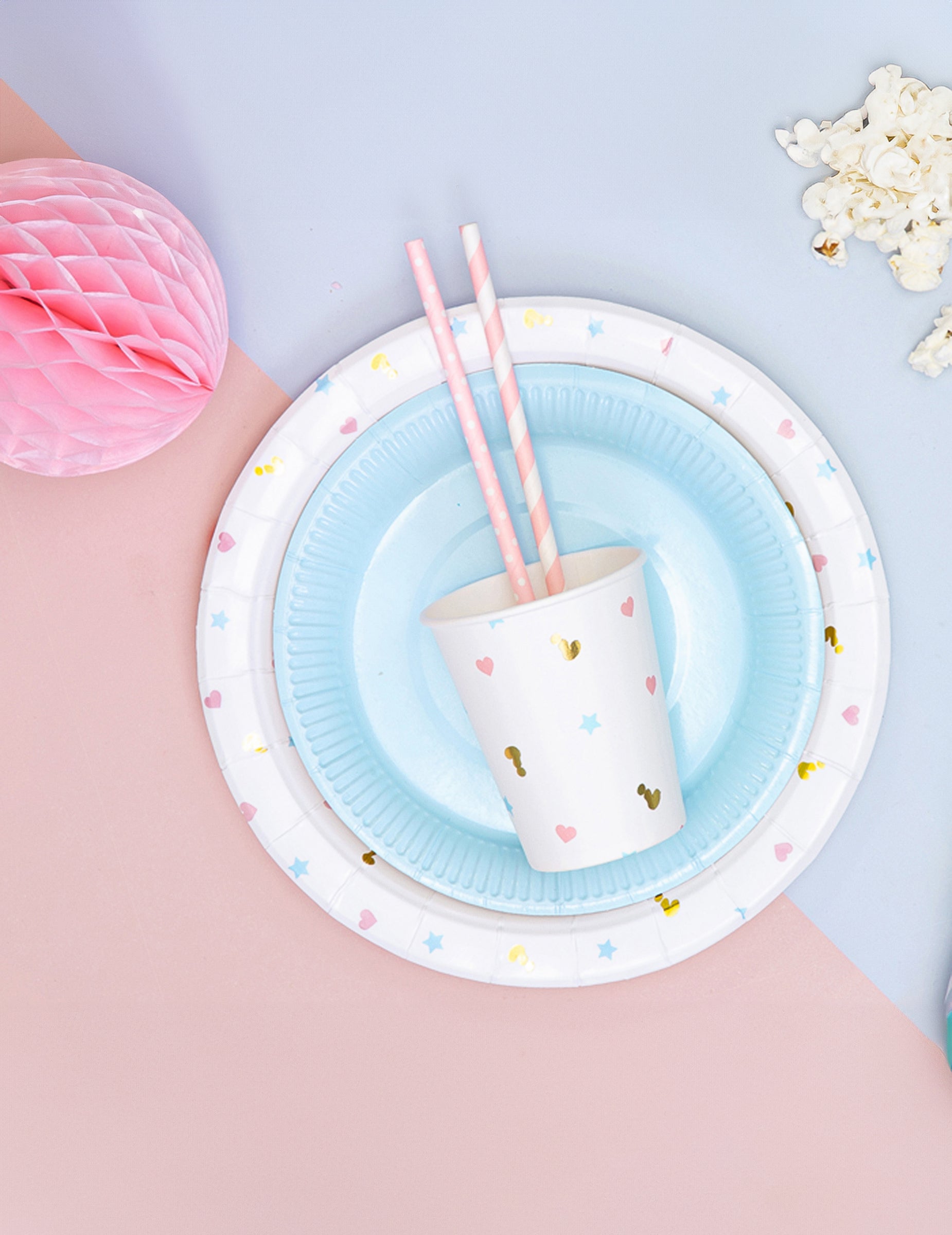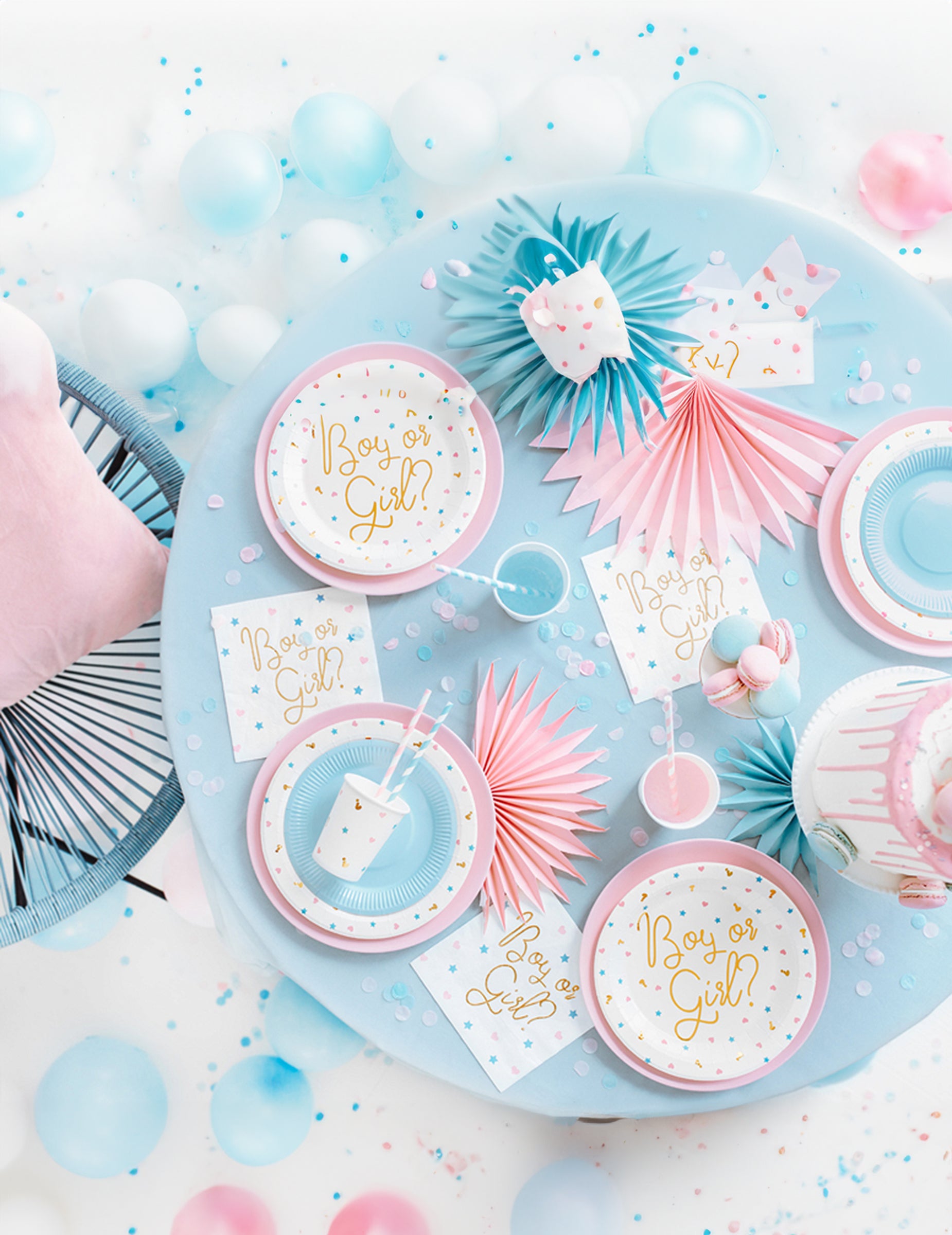 Apportez une touche de mystère à votre fête avec ce lot de 6 gobelets en carton blanc d'une capacité de 200 ml. Ornés de motifs dorés, roses et bleus, ces contenants arborent des points d'interrogation, des cœurs et des étoiles. Ces gobelets sont l'accessoire idéal pour entretenir le suspense concernant le sexe du bébé durant votre baby shower.