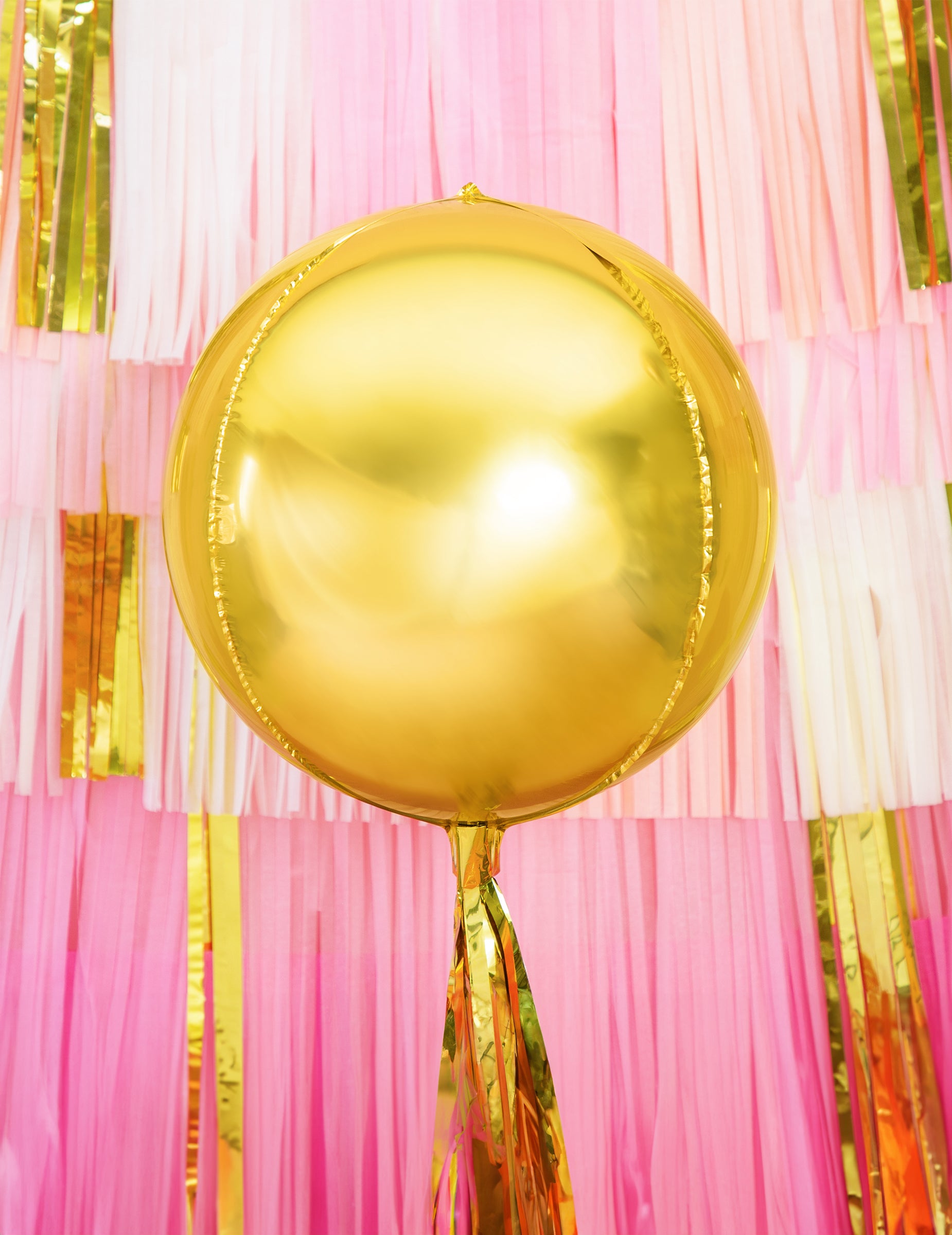 Ta aluminijasta kroglica je premera približno 40 cm. Zlatega je barv s kovinskim videzom. Lahko ga napihnete z zrakom ali helijem. Ta kroglica bo idealna za blingo ali šik temo na temo!