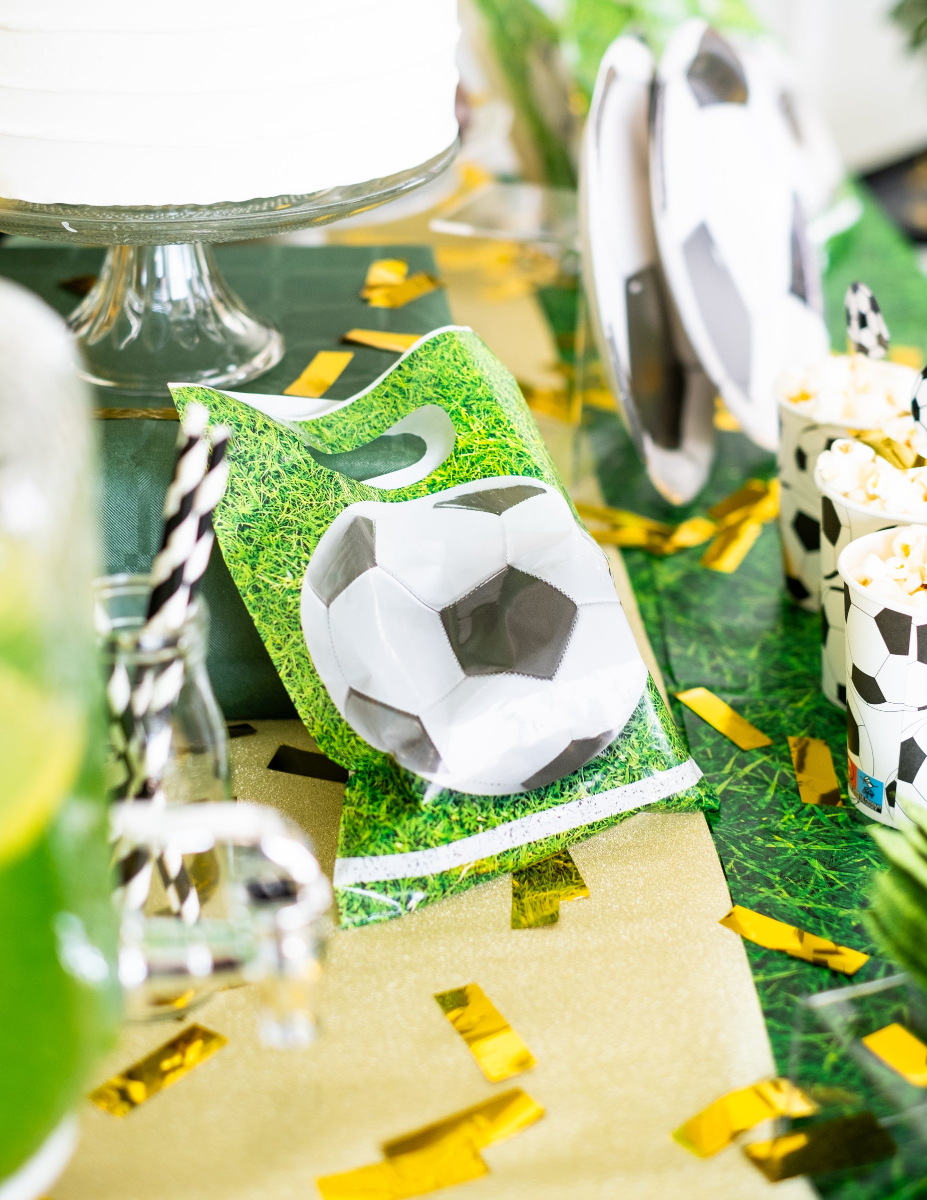 Ce lot contient 6 sacs de fête thématiques. Chaque pochette mesure environ 23 x 16 cm et affiche un visuel dynamique de ballon de foot sur la pelouse d'un stade. Ces sacs cadeaux sont parfaits pour distribuer des friandises ou des surprises aux petits invités lors d'un anniversaire foot réussi.