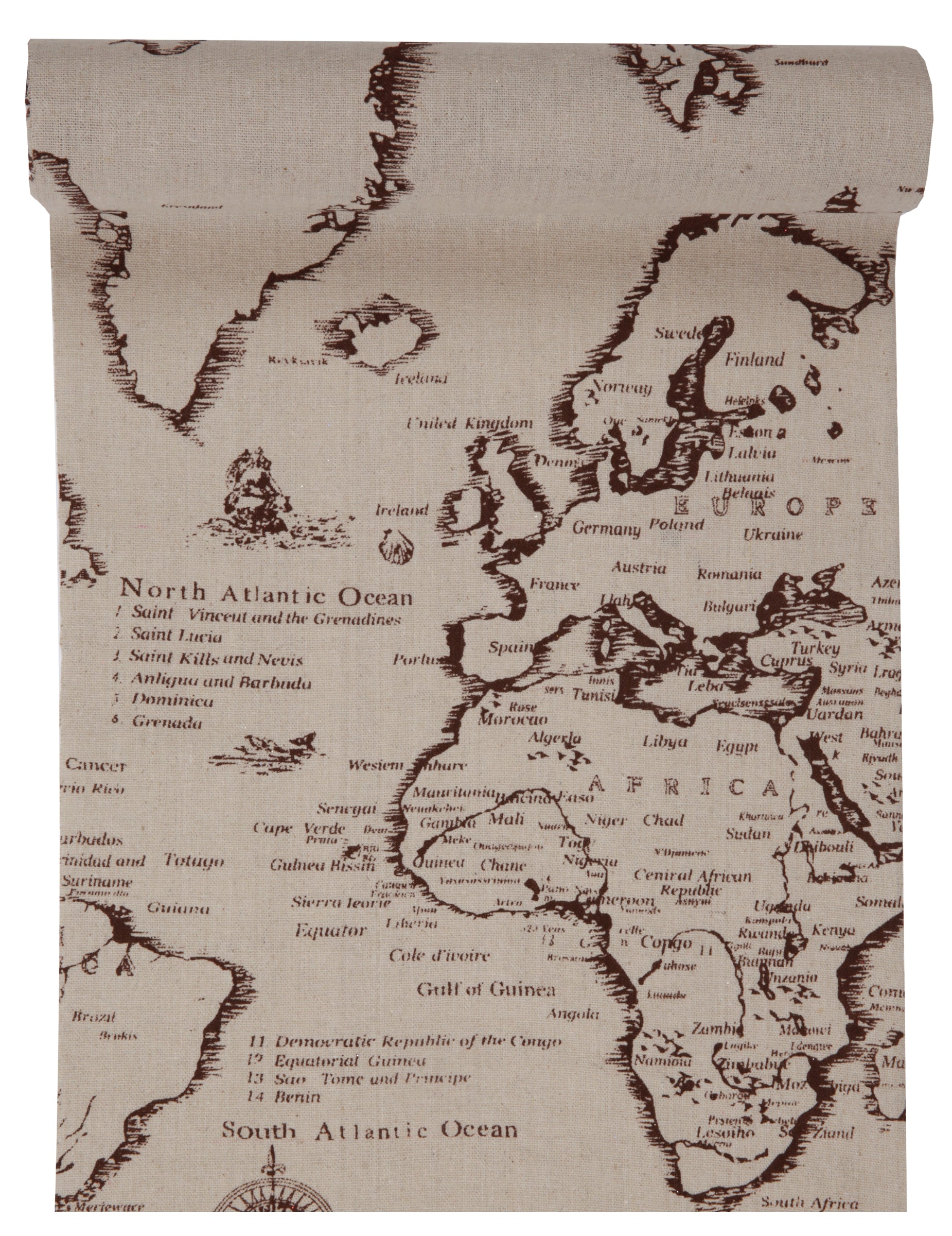 Décorez votre réception avec élégance grâce à ce chemin de table en coton d'une longueur de 3 m et d'une largeur de 28 cm. Illustré d'une superbe carte du monde présentant les différents pays et océans, il invite à la découverte. Ce chemin de table est l'accessoire indispensable pour parfaire un mariage à thème voyage ou tout événement festif tourné vers l'aventure.
