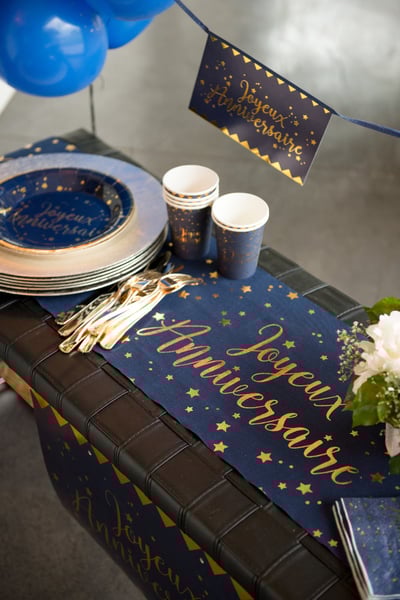 S tem dodate svojemu dekorju pridih elegance tekač za mizo 28 bombaža cm za 3 metre. Njegov temno moder odtenek poudarjajo bleščeče zvezde in sporočilo " Vse najboljše za rojstni dan " napisano z zlatimi črkami. Ta dodatek je kot nalašč za ustvarjanje rojstnodnevna miza hkrati šik in praznično.