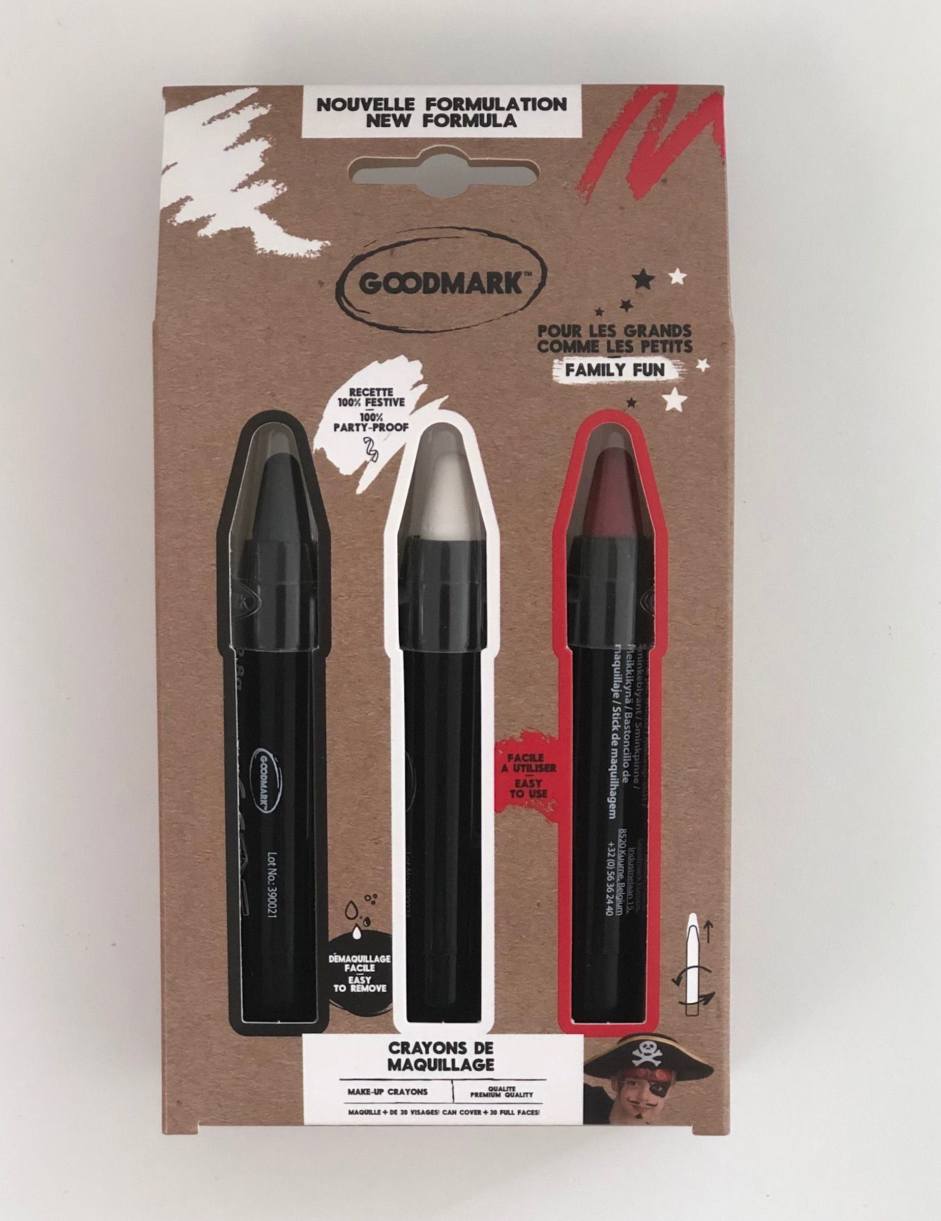 Ta serija je sestavljena iz treh ličilnih svinčnikov. Imeli boste črni svinčnik, belo in rdečo. Za mlade in stare vam bodo ti barvni svinčniki omogočili dokončanje kakršnih koli kostumov: mime, okostje, gusar ... bodisi za karneval ali za noč čarovnic, si pomagajte s temi svinčniki, da ustvarite lepo znamko. Sestavine: bele: CI 77891, semensko olje Ricinus Communis, gliceril stearat, PEG-100 stearata, parafinum likvidacije, Ceteareth-20, Sorbitan Laurate, Cera Alba, polisorbat 20, fenoksietanol, fenoksietanol, fenoksietanol, fenoksietanol, Sorbic, Sorbic, SOCOPHER. Črno, rdeče: semensko olje Ricinus Communis, gliceril stearat, PEG-100 stearata, parafinum likvidacije, Ceteareth-20, Cera Alba, sorbitan laurat, polisorbat 20, fenoksietanol, sorbična kislina, tokoferol. (+/-): CI 77499, CI 12490, CI 73360.