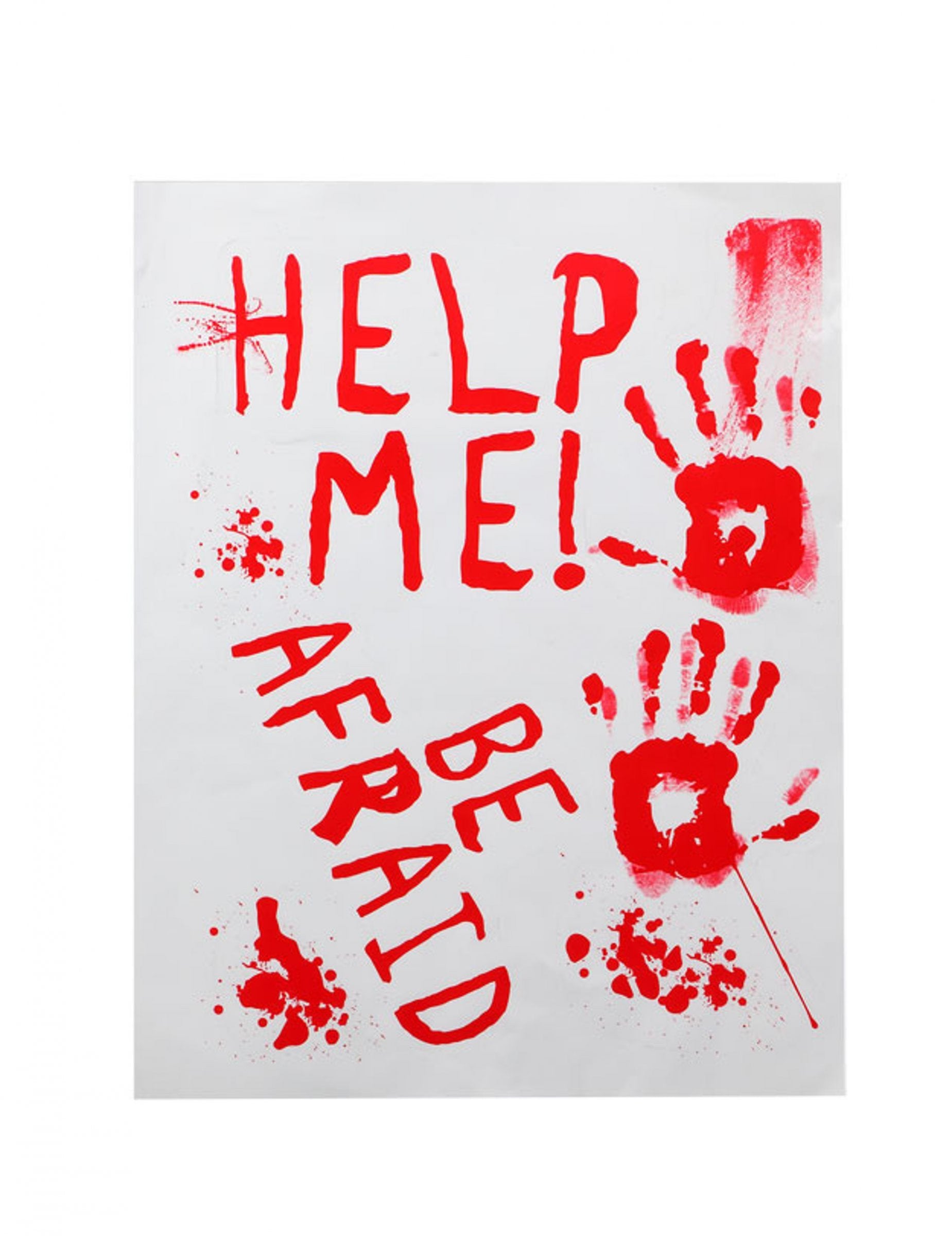 Ta plakat meri približno 42 x 19 cm. Je bela in ima sledi rok, lažne krvne pike in napisi "pomagajo mi" in se "bojte". Ta plakat bo kot nalašč za okrasitev vaše sobe med noč čarovnic!