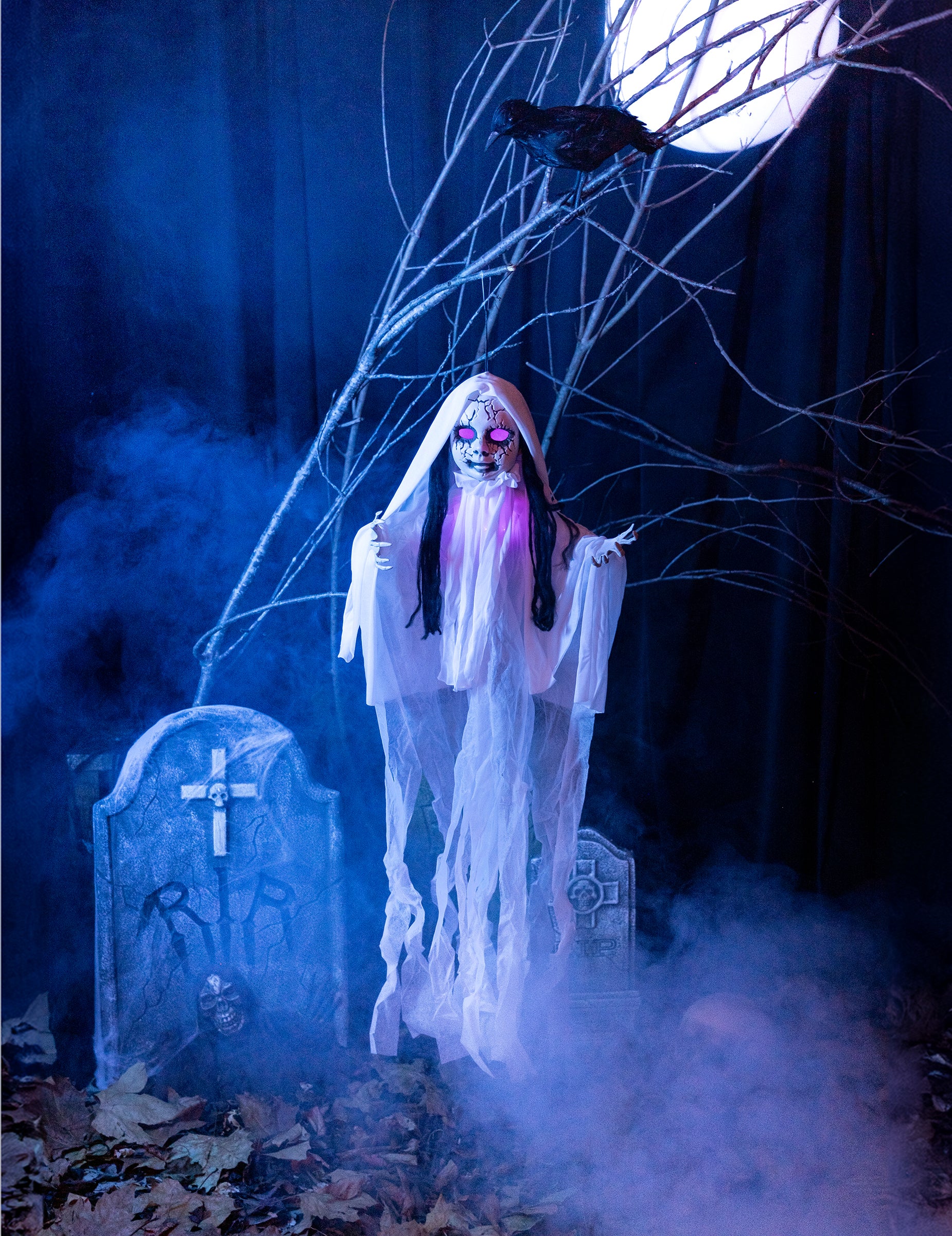 Ta dekoracija predstavlja lutko Macabre. Meri približno 100 x 70 cm. Ima siv obraz s črnimi razpokami. Lažni črni lasje so prisotni na obeh straneh obraza. Ta lutka ima tudi skeletne roke. Ima sistem, ki vam omogoča, da ga prižgete (baterije niso vključene). To bo kot nalašč za dokončanje dekoracije na noč čarovnic.
