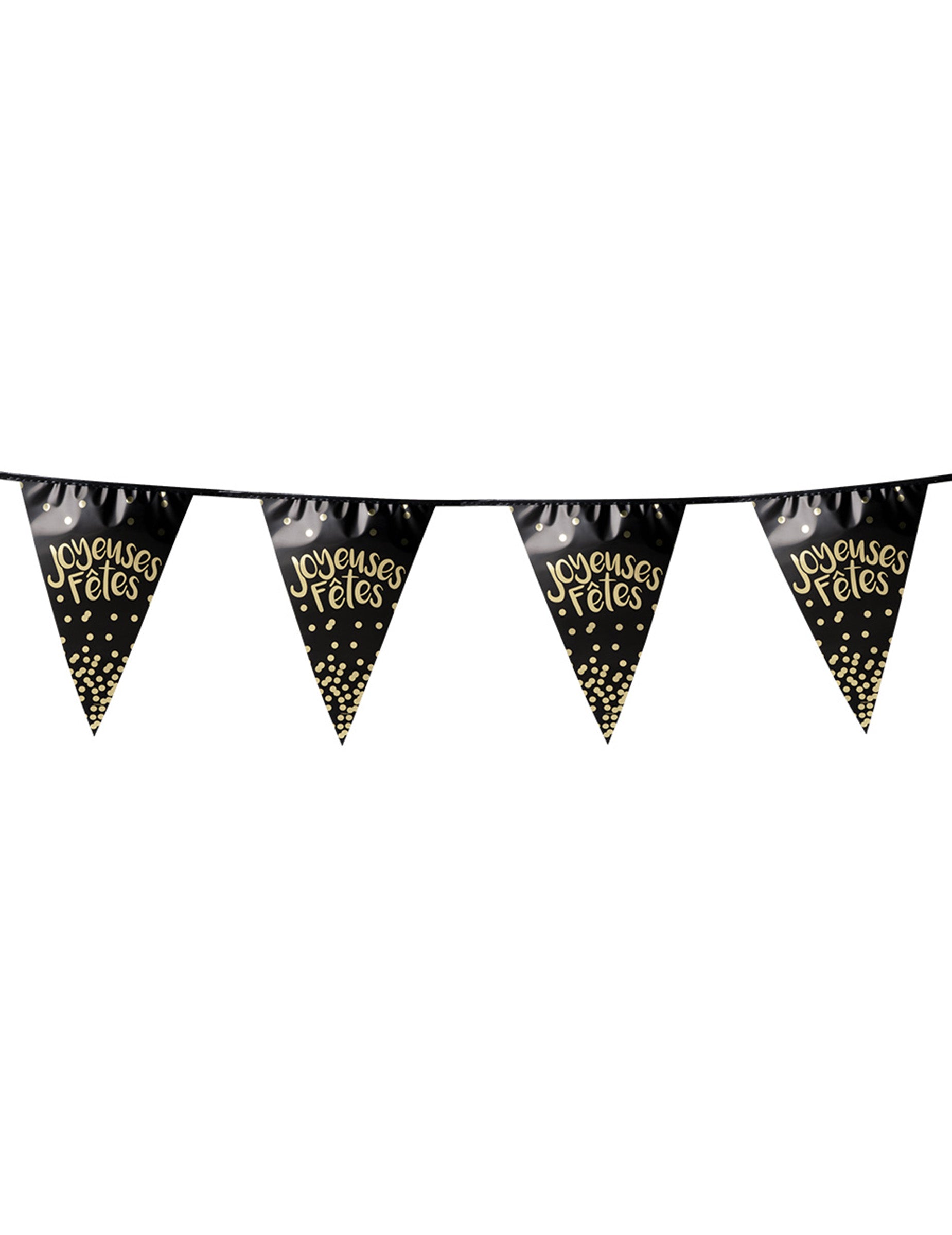 S skupno dolžino 4 metre, ta venec Sestavljen je iz 10 elegantnih zastavic. Vsaka zastavica ima črno ozadje, okrašeno s konfeti in sporočilom " Vesele praznike " z zlatimi kovinskimi črkami. Je popoln dodatek za izboljšanje vašega praznovanja ob koncu leta z elegantnim in penečim pridihom.