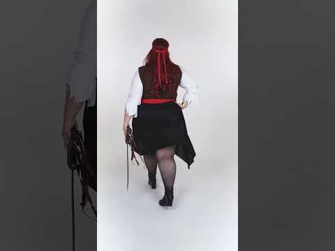 Ta velik črtasti piratski kostum je namenjen ženskam. Vključuje transparent, vrh, telovnik, krilo in pas (sablja in škornji niso vključeni). Vrh je povsem bel. Dolgi rokavi so široki za še več realizma. Telovnik je v imitaciji rjave seminske tkanine. Zlati šiv prinaša predpomnilnik v ta jopič. Krilo je v črni tkanini s črno in modro črtasto ploščo. na sprednji strani. Ima asimetrično obliko. Končno je vključen saten rdeči pas, ki ga je treba privezati okoli pasu. Ta piratski kostum za ženske je ideje "AL za vse vaše prikrite večere.