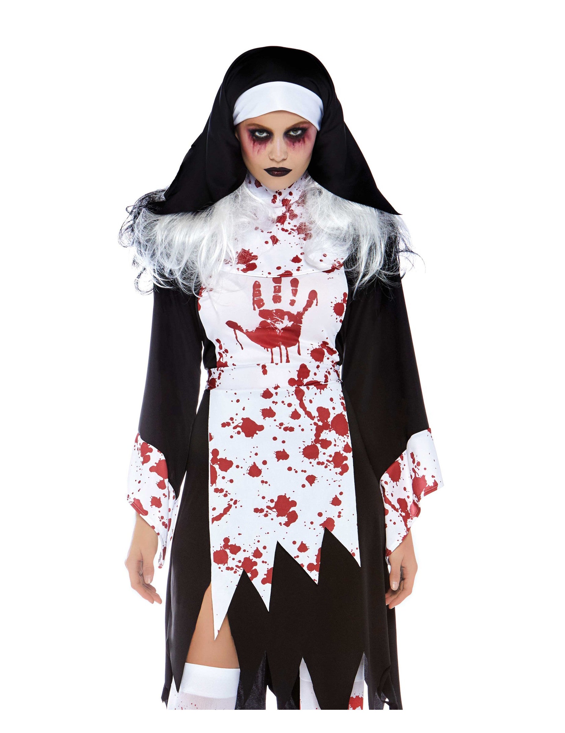 Ta kostum morilske nune za ženske je sestavljen iz obleke in naglavnega pokrivala (lasulja in nogavice niso vključene). Kratka obleka je na spodnjem delu izrezana v konice. Opremljena je z belim predpasnikom z madeži umetne krvi.
