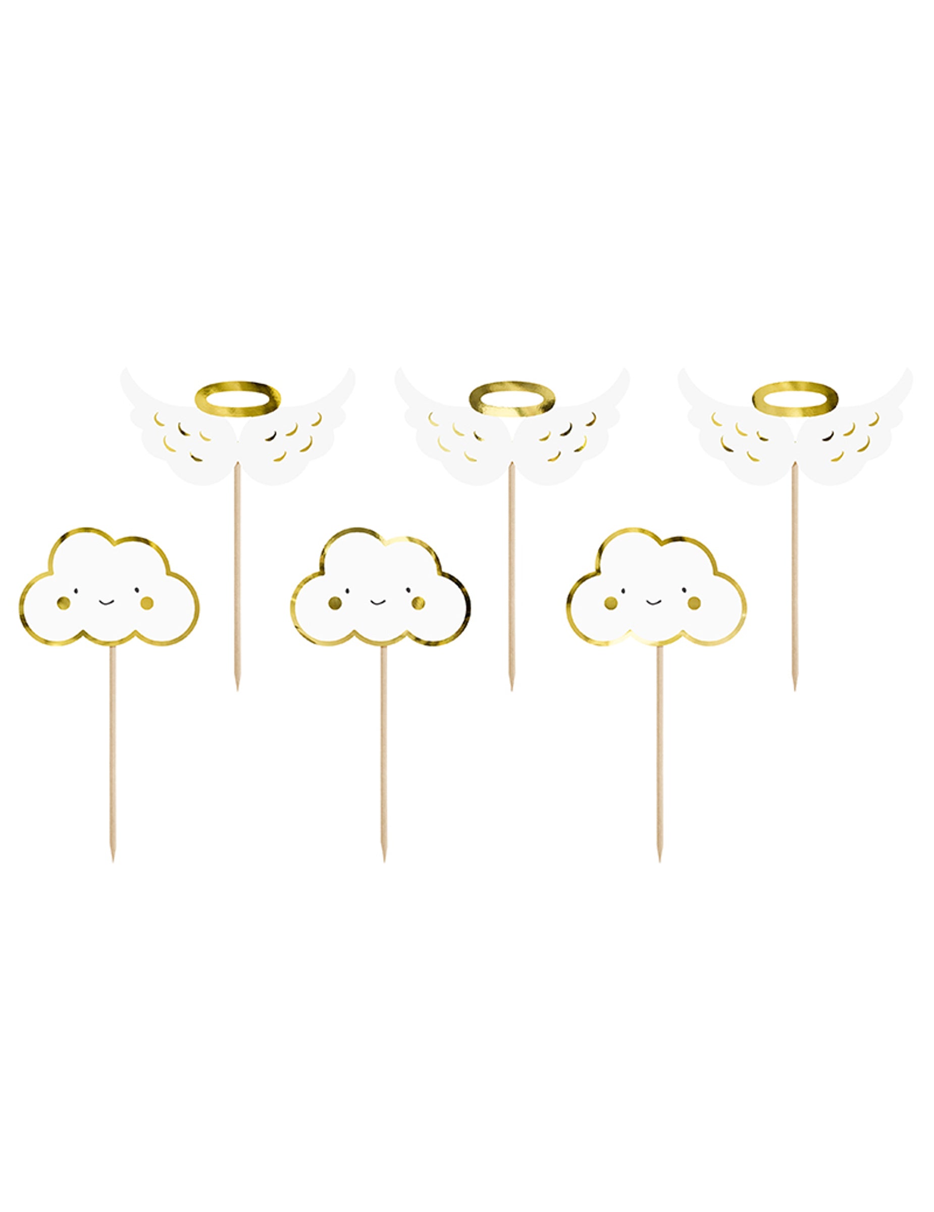 S tem kompletom 6 kosov dodajte svojim pecivom kanček sladkosti okraski za torte Izdelano iz lesa z belo in zlato obdelavo. Višina 12,5 cm. cm, Ti okraski lepo ponazarjajo oblaki kot tudi krila Angeli s svojimi avreolami. Popolni bodo za okrasitev vaših prazničnih tort. rojstni dan ali a otroška zabava nepozabno.