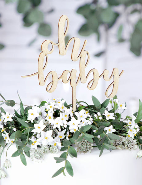 Ima nežen napis "Oh baby" za naravno dekoracijo.