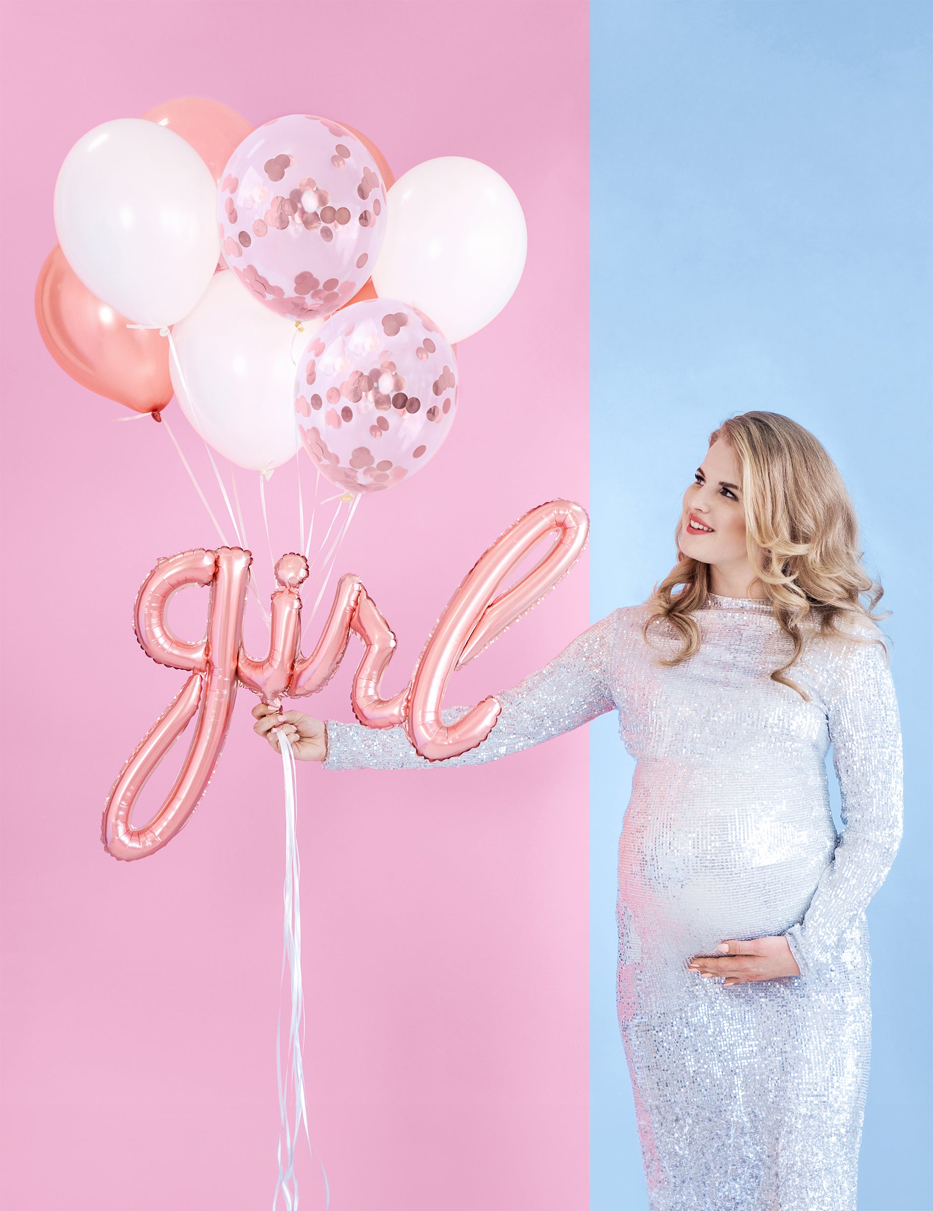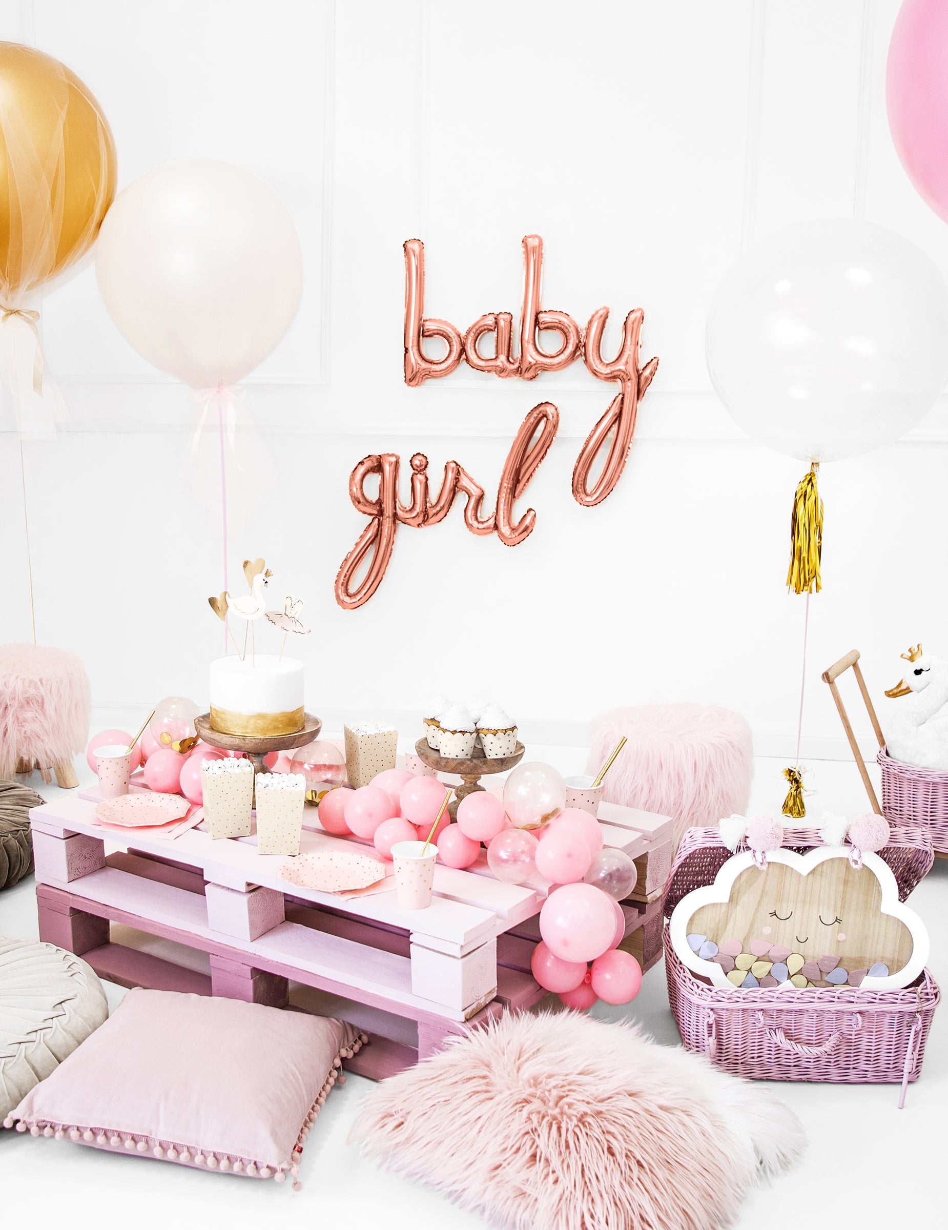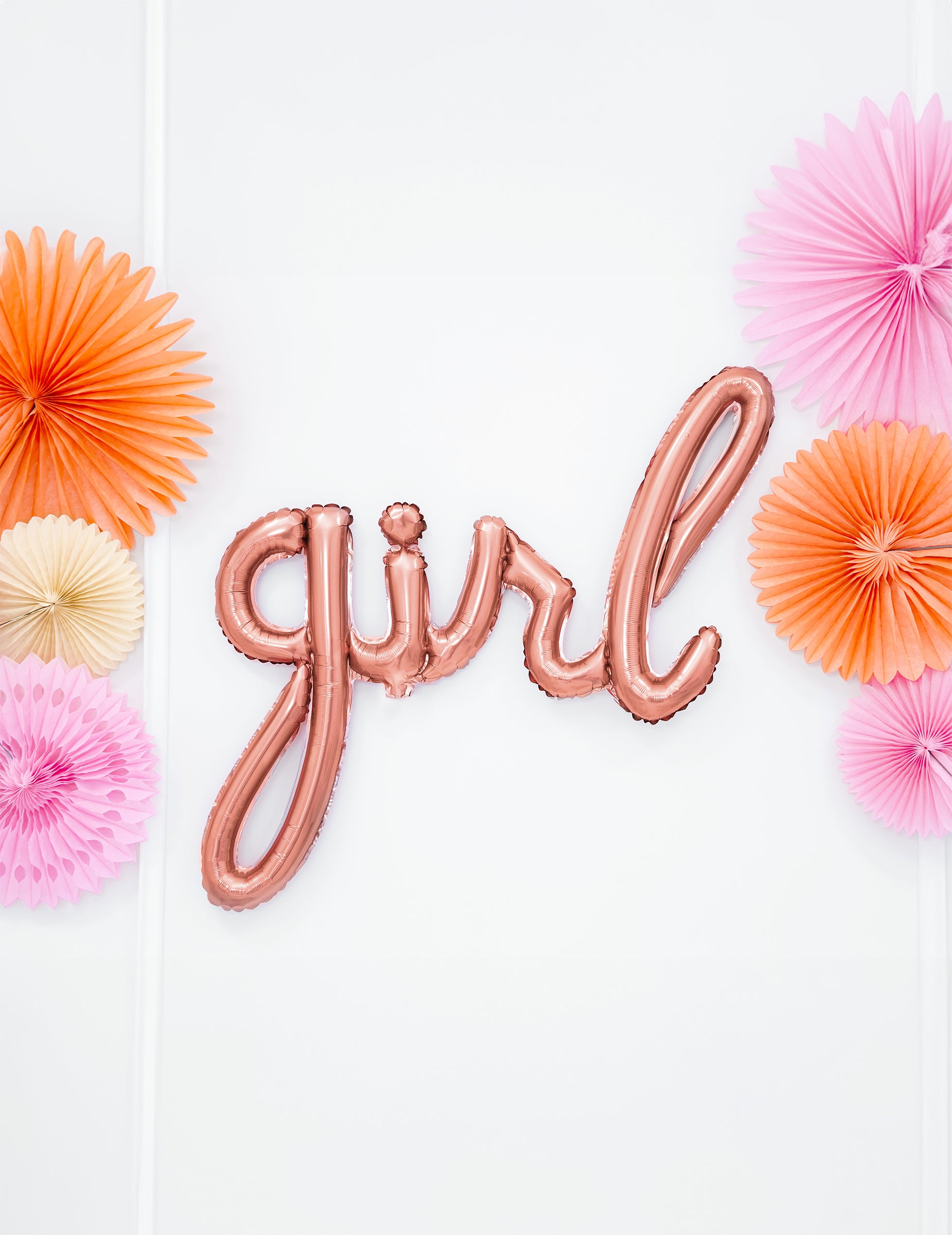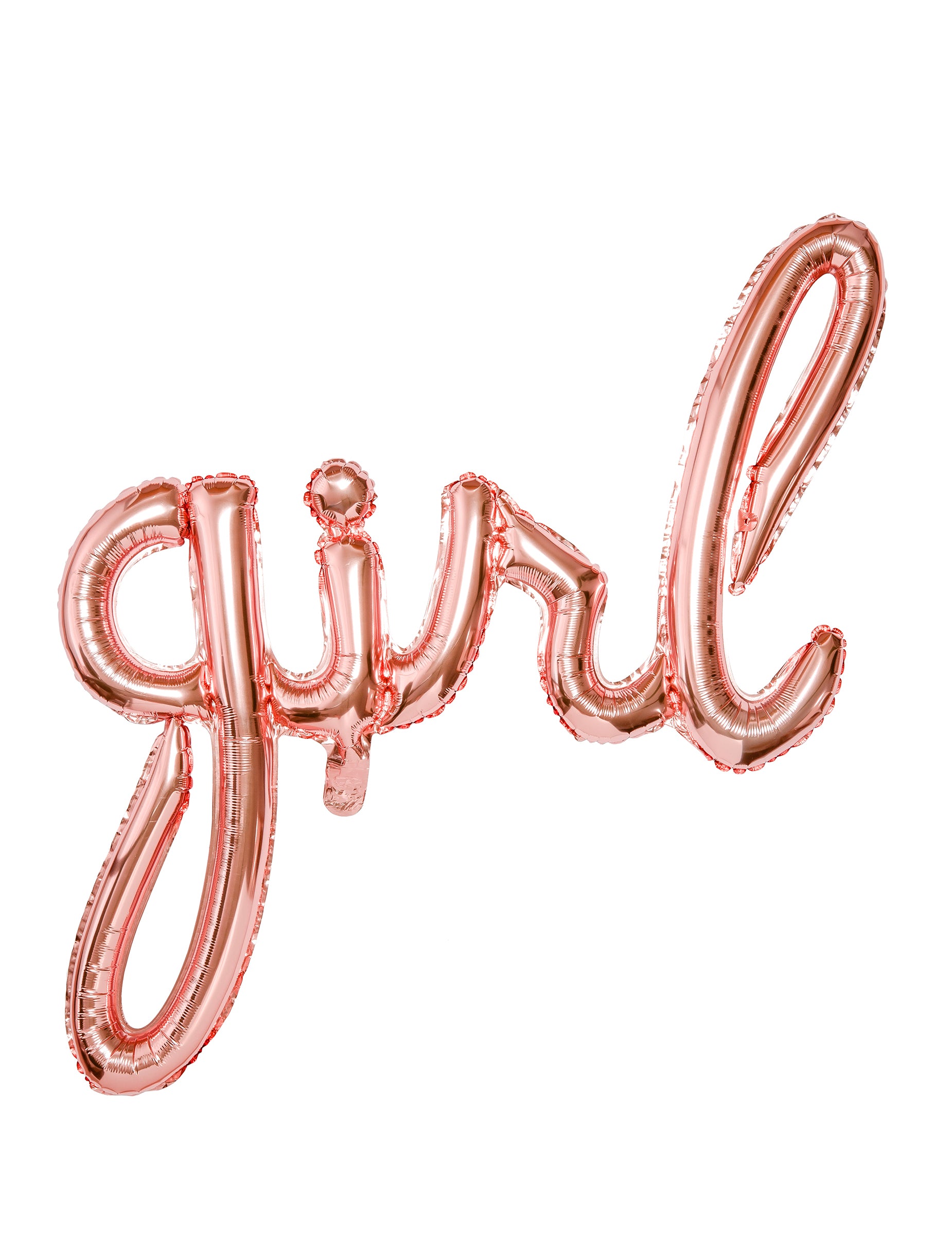 Ta aluminijast balon je zlato roza barv. Predstavlja besedo "dekle" in meri približno 77 x 70 cm. Lahko ga napihnete v zraku in ga med otroškim tušem obesite čez bife.