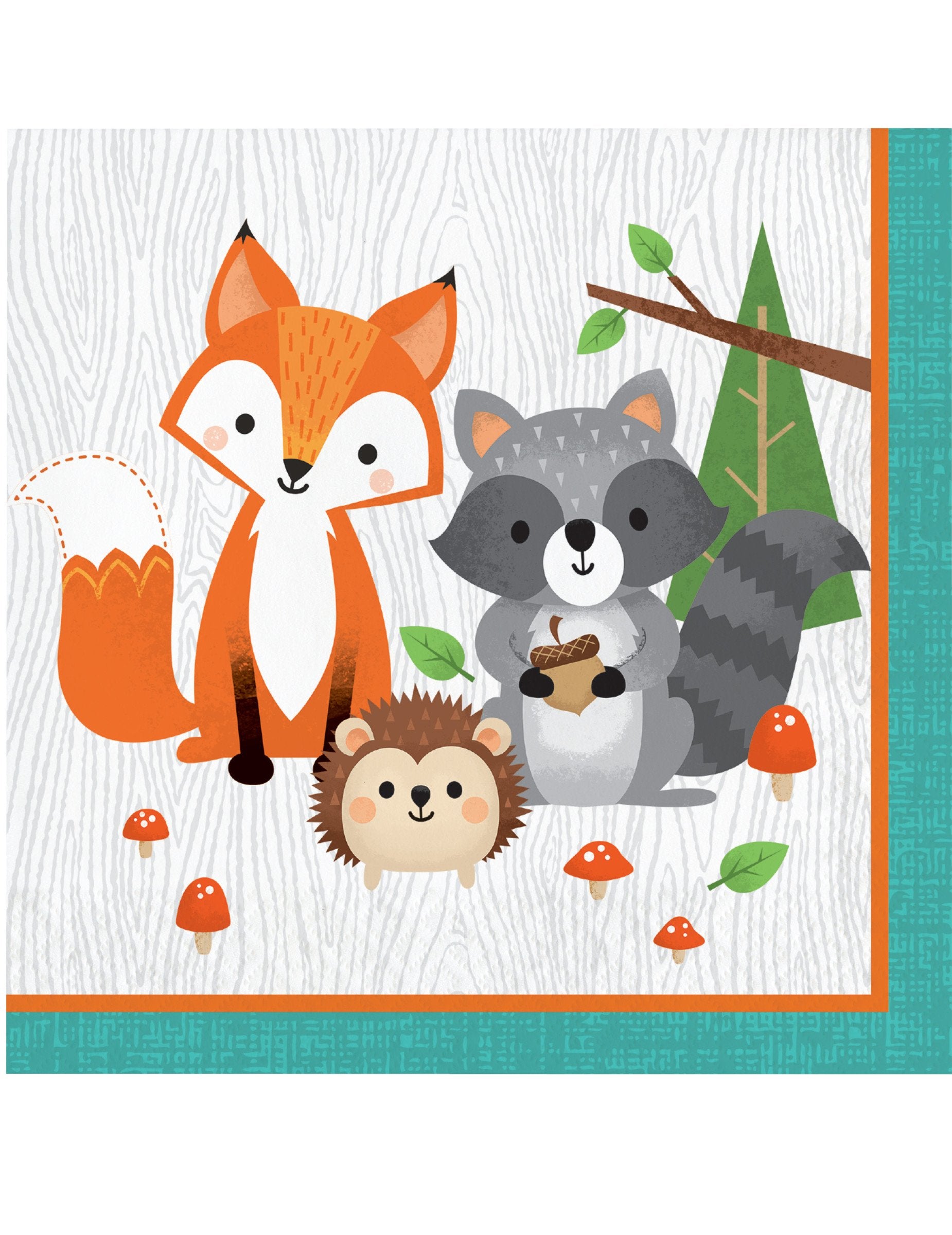 Apportez une touche sauvage à votre fête avec ce lot de 16 serviettes jetables. Ces accessoires de table mesurent 33 x 33 cm lorsqu'ils sont ouverts. Ornées d'une bordure turquoise, elles mettent en scène d'adorables animaux de la forêt tels qu'un renard, un raton laveur et un petit hérisson. Ces serviettes sont idéales pour sublimer une table d'anniversaire sur le thème de la nature.
