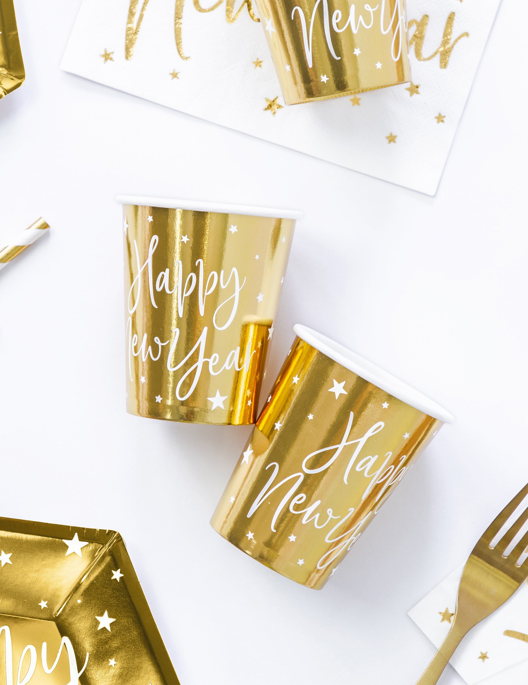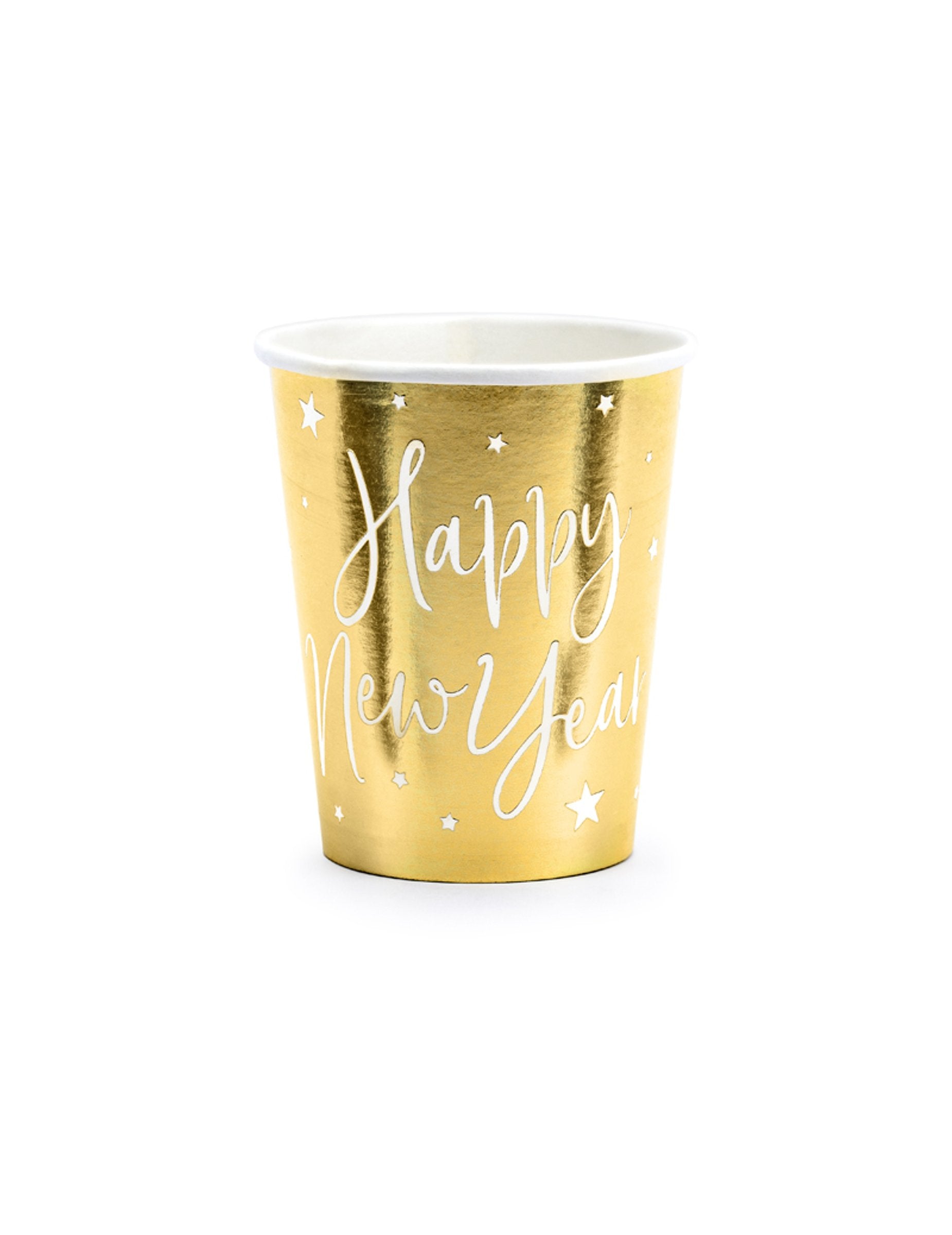 Polepšajte svoje okraske za zabavo s tem kompletom 6 kosov skodelice kartonske stekleničke s prostornino približno 220 ml. Z elegantno kovinsko zlato prevleko so okrašene z nežnimi zvezdicami in sporočilom " Srečno novo leto! v belem kontrastu. Te skodelice so idealen dodatek, ki bo vaši mizi vnesel šik in peneče vzdušje. Novo leto.