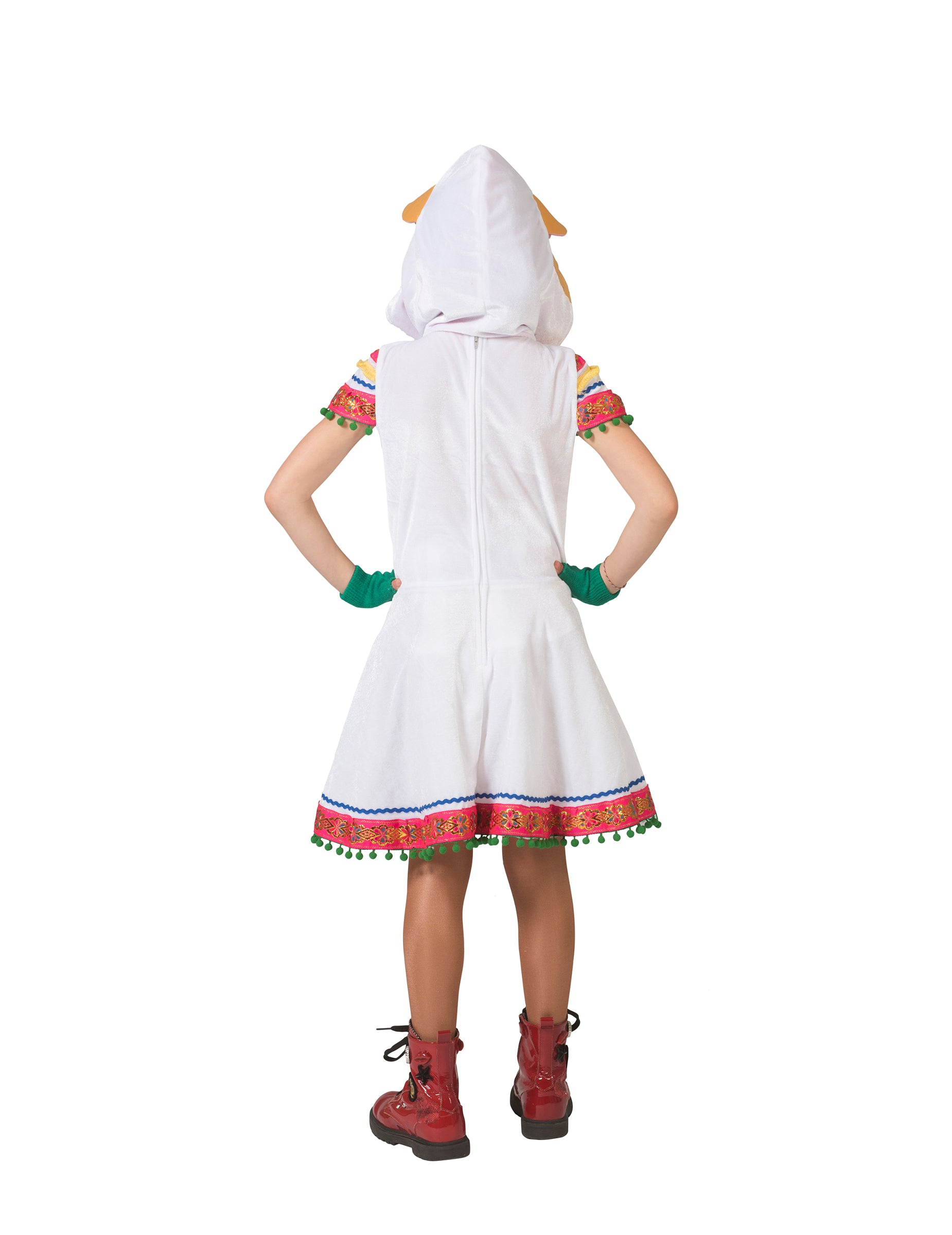 Ta perujska preobleka za dekle ima kapuco. Ta obleka je bela je kratka. Zapiranje osvetli na vopusu nazaj, da ga bo omogočil, da ga prenese brez težav. Okoli ovratnika in dna obleke so prisotne pisane plošče s pompomi. Z obleko je prišit tudi lažni modri pas, ki pade na krilo. Potok je tudi nad lamovo glavo za še več šarma. Ta perujski kostum bo kot nalašč za karneval ali večer na temo Latinske Amerike.