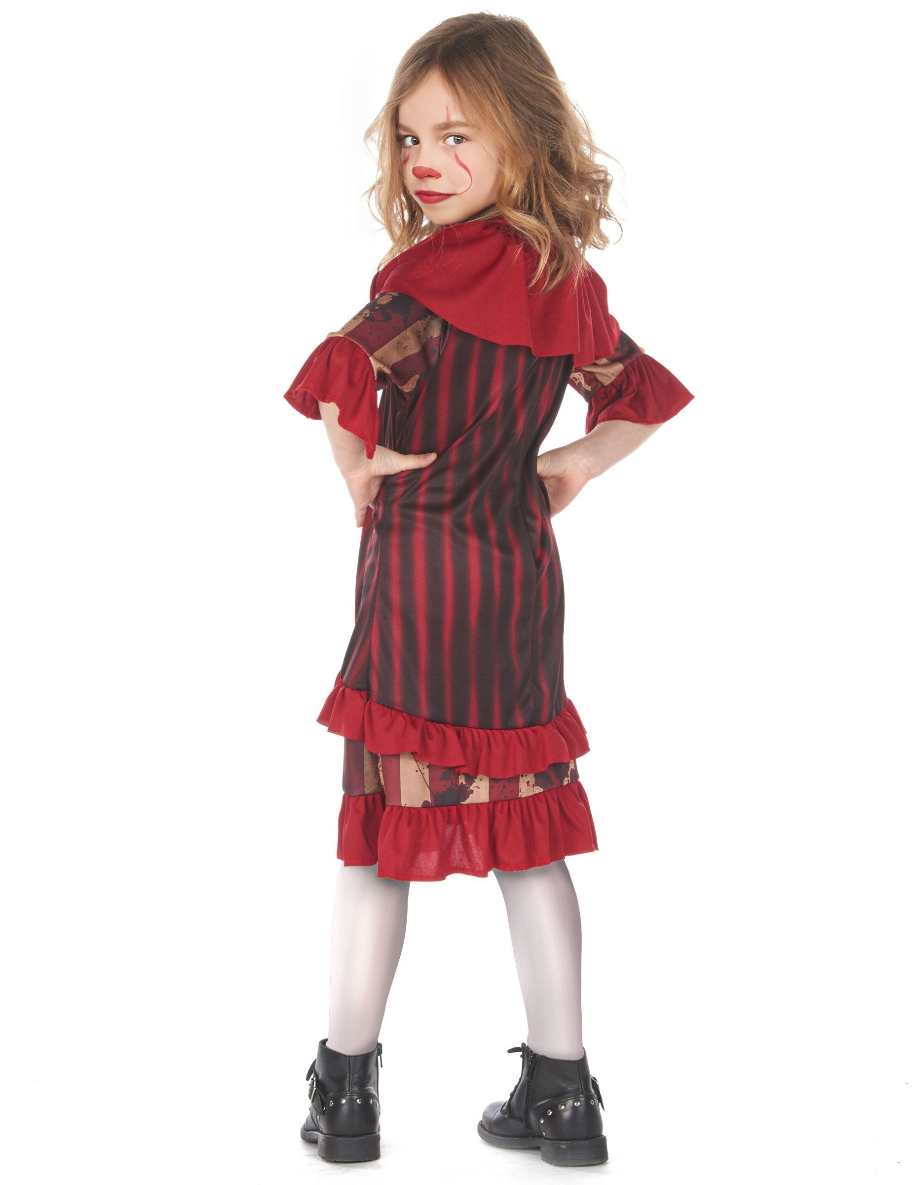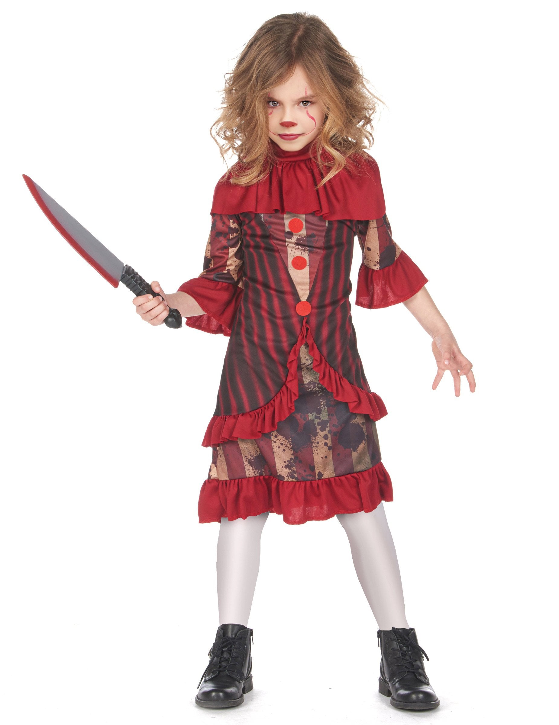 To grozljiv klovnov kostum Za deklice je sestavljen iz obleke in ovratnika (nož, hlačne nogavice in čevlji niso vključeni).