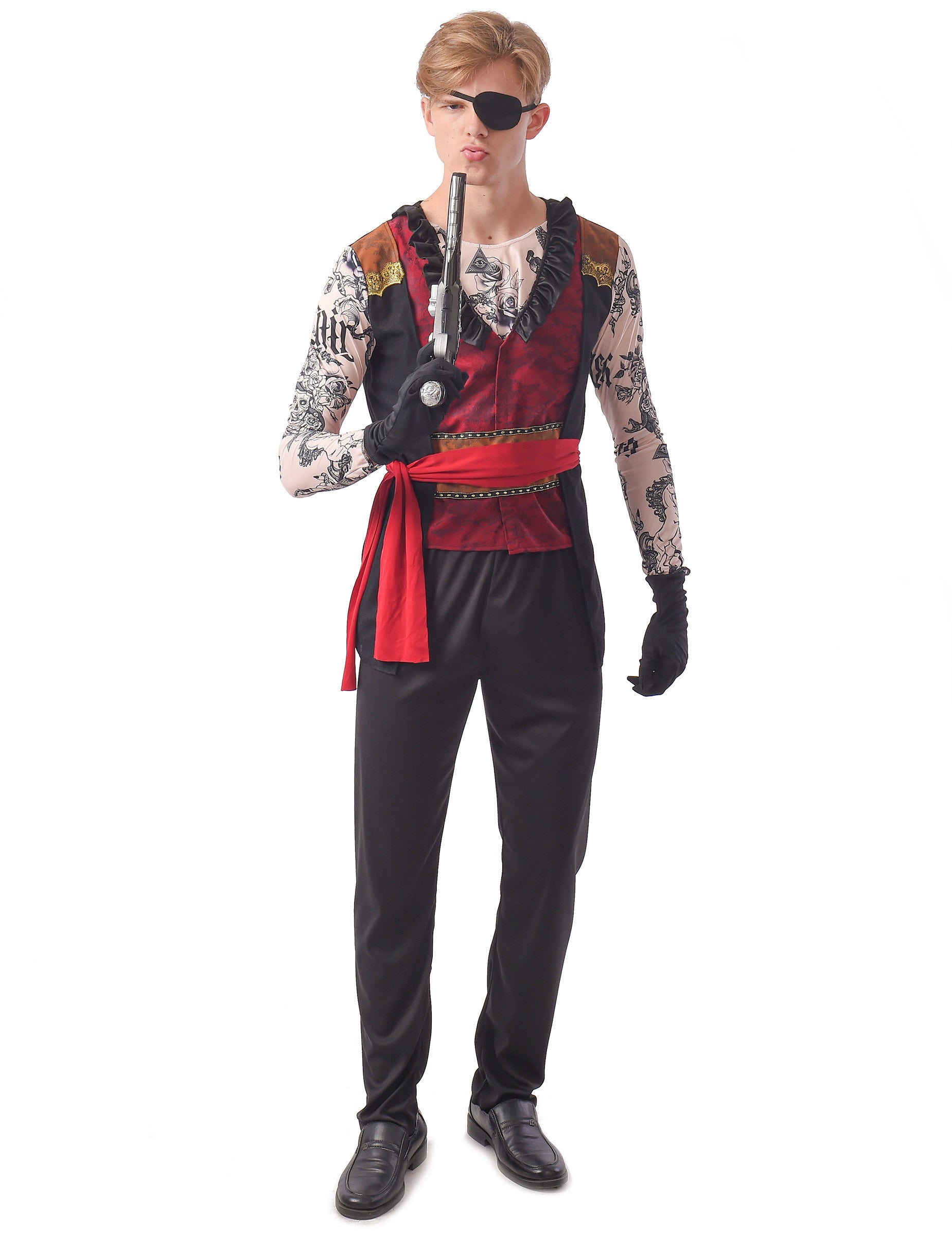 Ta moška tetovirana gusarska preobleka je sestavljena iz vrha, pasu in predpomnilnika (hlače, čevlji in rokavice niso vključeni). Vrh je rdeč in črn. Okrasi ga z zlatimi vzorci in ramena so rjave barve. Ovratnik je v obliki v obliki in je okrašen s črnimi naboji. Pod -Un je prišit na majici in je pregledno bela barva s črnimi vzorci, ki predstavljajo lažne tetovaže. Pas je rdeč in privezan okoli pasu. Pokrov se zlahka vzdržuje z obrazom z uporabo elastike. Ta tetovirana gusarska preobleka bo kot nalašč za utelešenje pravega gusarja ob karnevala ali med tematskim večerom!