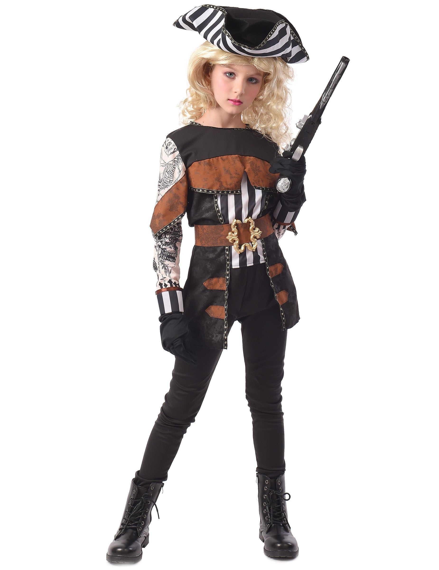 Ta dekliška piratska kostum je sestavljen iz vrha, hlač, pasu in klobuka (čevlji za rokavice, lasulje in pištola niso vključeni). Vrh je črn in rjav. Okrašena je s črno -belimi črtami in ima lažni črni jopič. Rokavi so beli s črnimi vzorci, ki so videti kot lažne tetovaže. Pas je rjav barv, okrašen z veličastno zlatim pasom. Zlahka se bo osredotočila na pas. Klobuk je Tricorne. Zgoraj je črna in je okrašena z belimi in črnimi črtami. Preobleka vključuje tudi črne hlače. Ta tetovirana gusarska preobleka bo kot nalašč za hčerko, da gre na karneval ali večer na piratsko temo!
