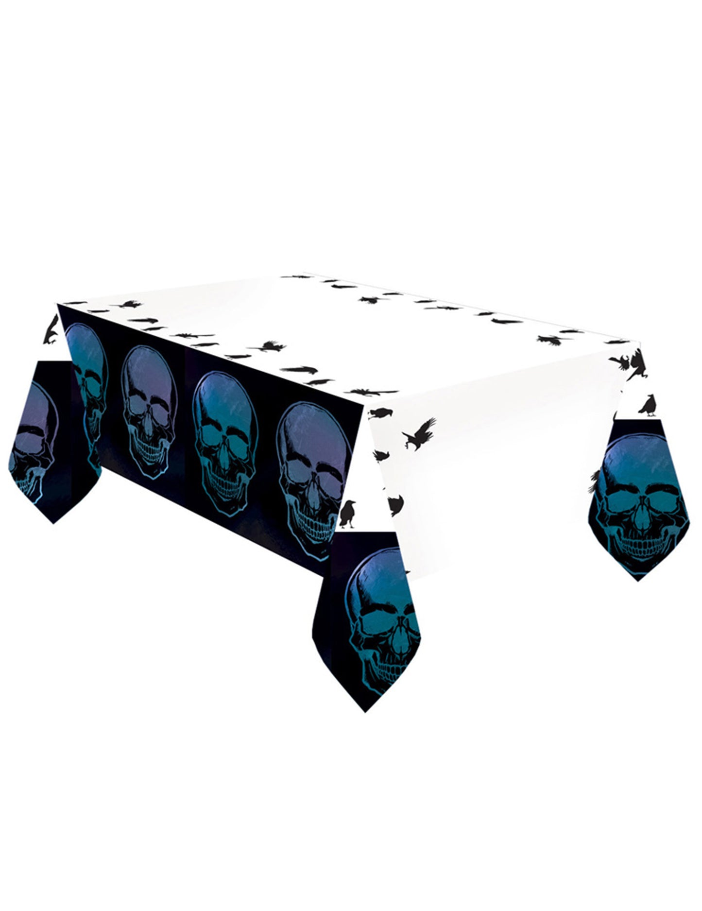 Ta bonešinska mrzlica je papir in meri približno 1,2 x 1,8 m. V sredini je bela in okrašena s črnimi vranami. Na robovih je črna in okrašena z modrimi in vijoličnimi lobanji. Ta prt Boneshine Fever bo kot nalašč za dokončanje dekoracije Boneshine Helf za noč čarovnic!