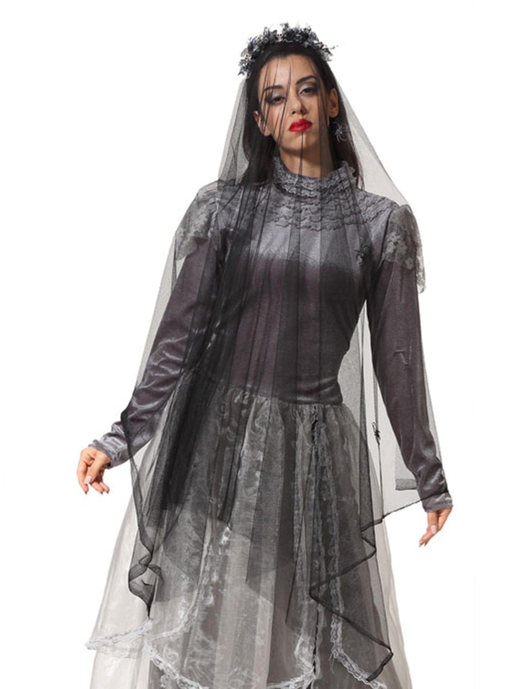 Ta dolga pogrebna poročna tančica je namenjena odraslim. Pripravljen je na traku za glavo z majhnimi okostji. Ta dolga tančica bo kot nalašč za dokončanje vašega duhovnega poročnega kostuma za noč čarovnic.
