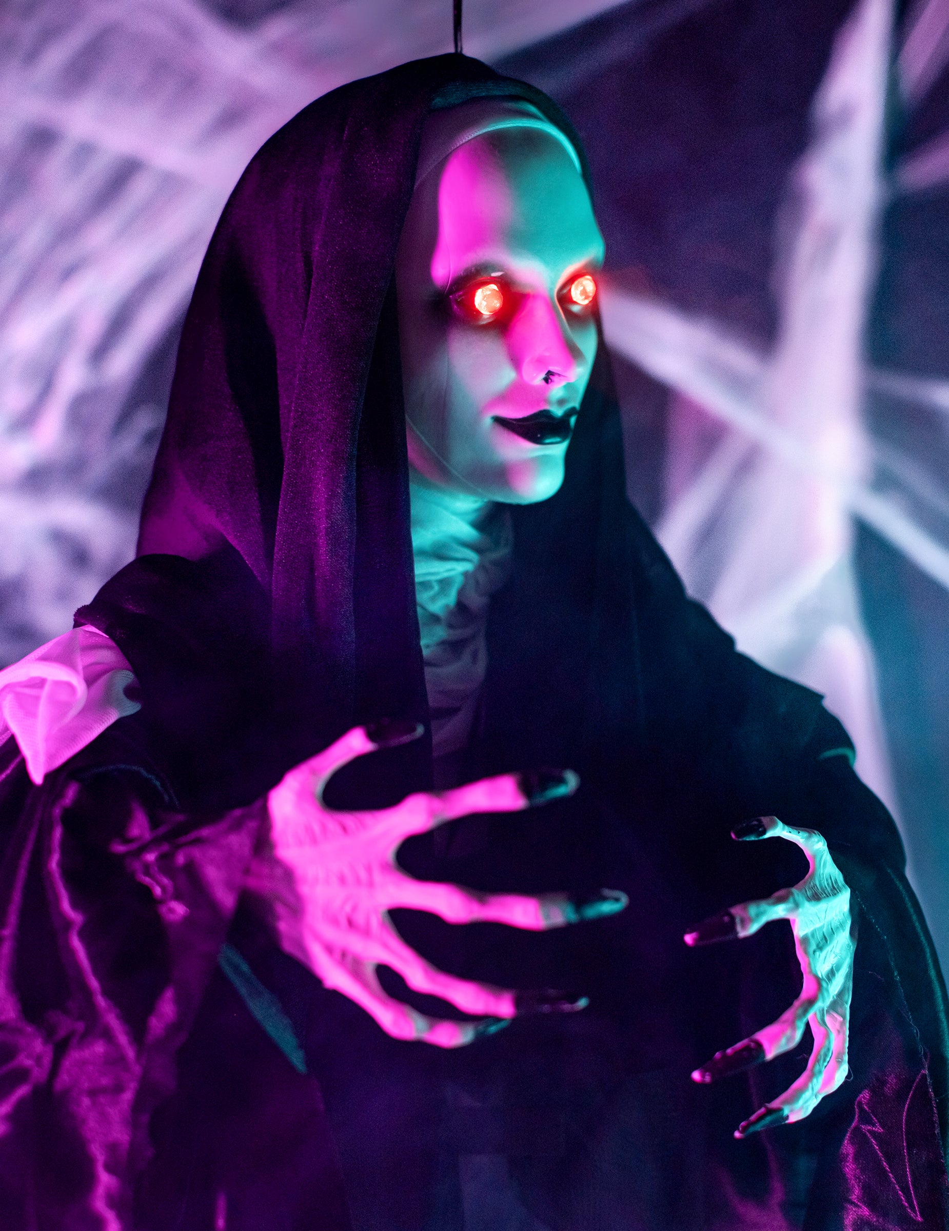 Ta svetlobna dekoracija predstavlja srhljivo redovnico. To meri približno 120 cm. Nudovski obraz je bel, z usti in obrisom črnih oči. Skeletne roke so prav tako blede. Nosi ogrlico z velikim črnim križem. Oči so svetle in bodo z osvetlitvijo postale rdeče. Deluje s 3 baterijami LR44. To vzmetenje bo kot nalašč za dokončanje dekoracije za noč čarovnic.