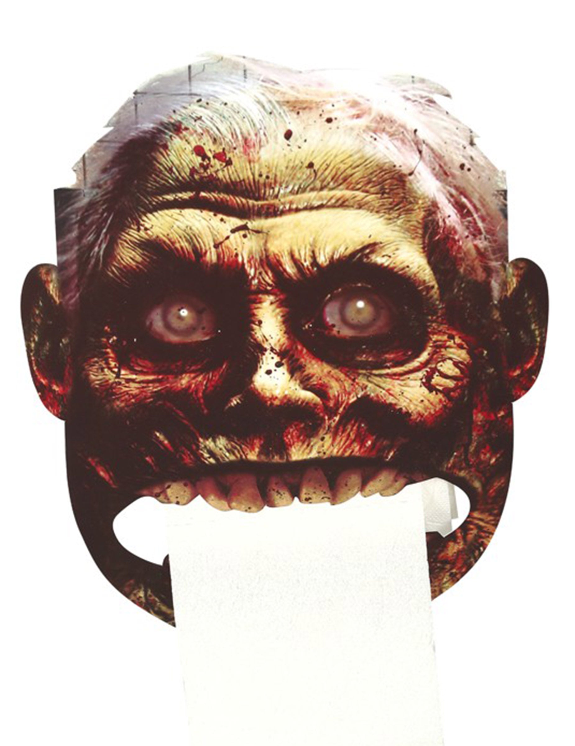 Predstavlja glavo zombija z odprtimi usti, skozi katere lahko poteka toaletni papir!