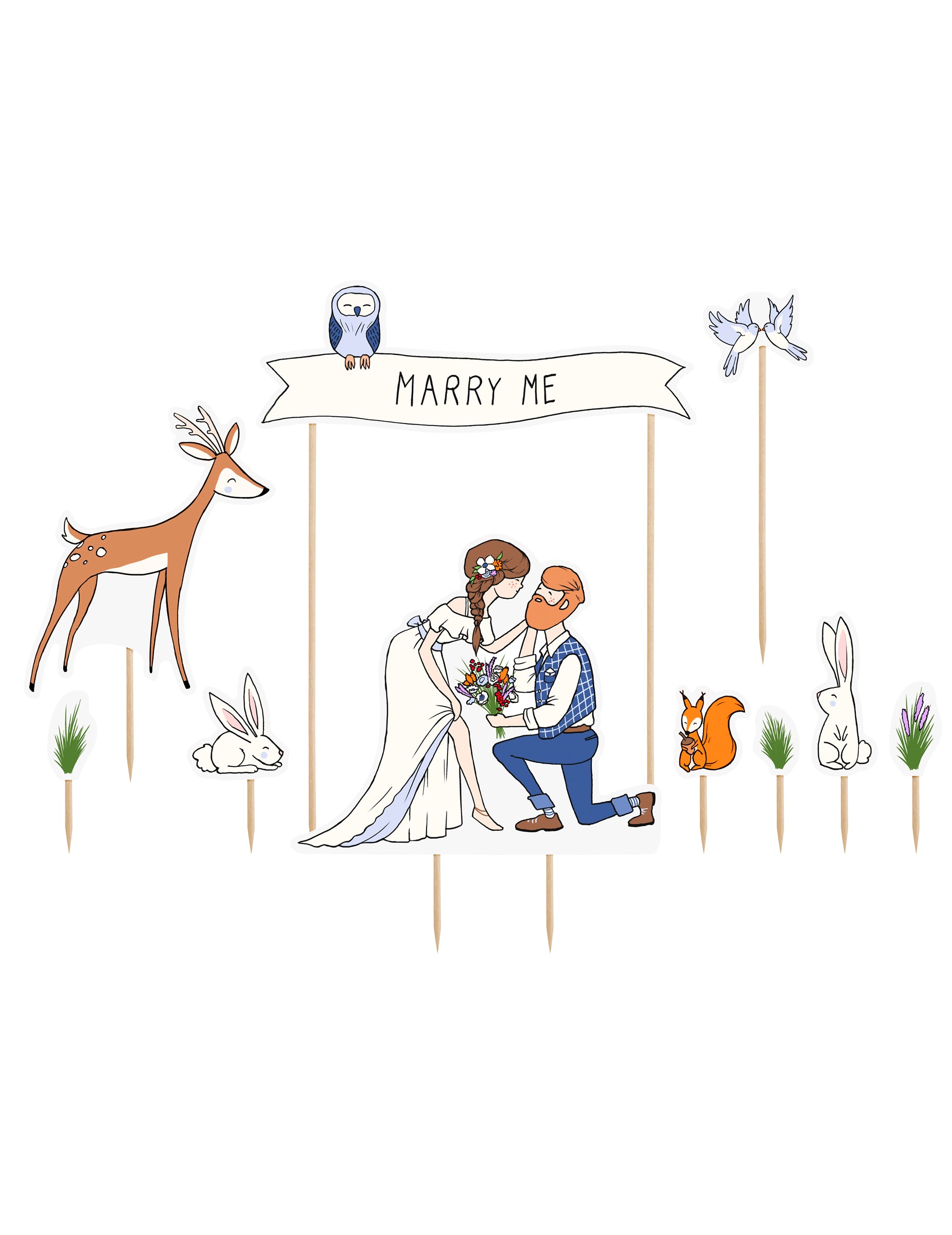 Vsaka figurica je izdelana iz prožnega kartona in nameščena na leseno podlago. Ta dekorativni komplet vsebuje transparent "poroči se z mano", boemska nevesto in ženina, jelena, dva zajca, par golobov, veverico in tri divje rože. Najvišji okras doseže 23 cm.