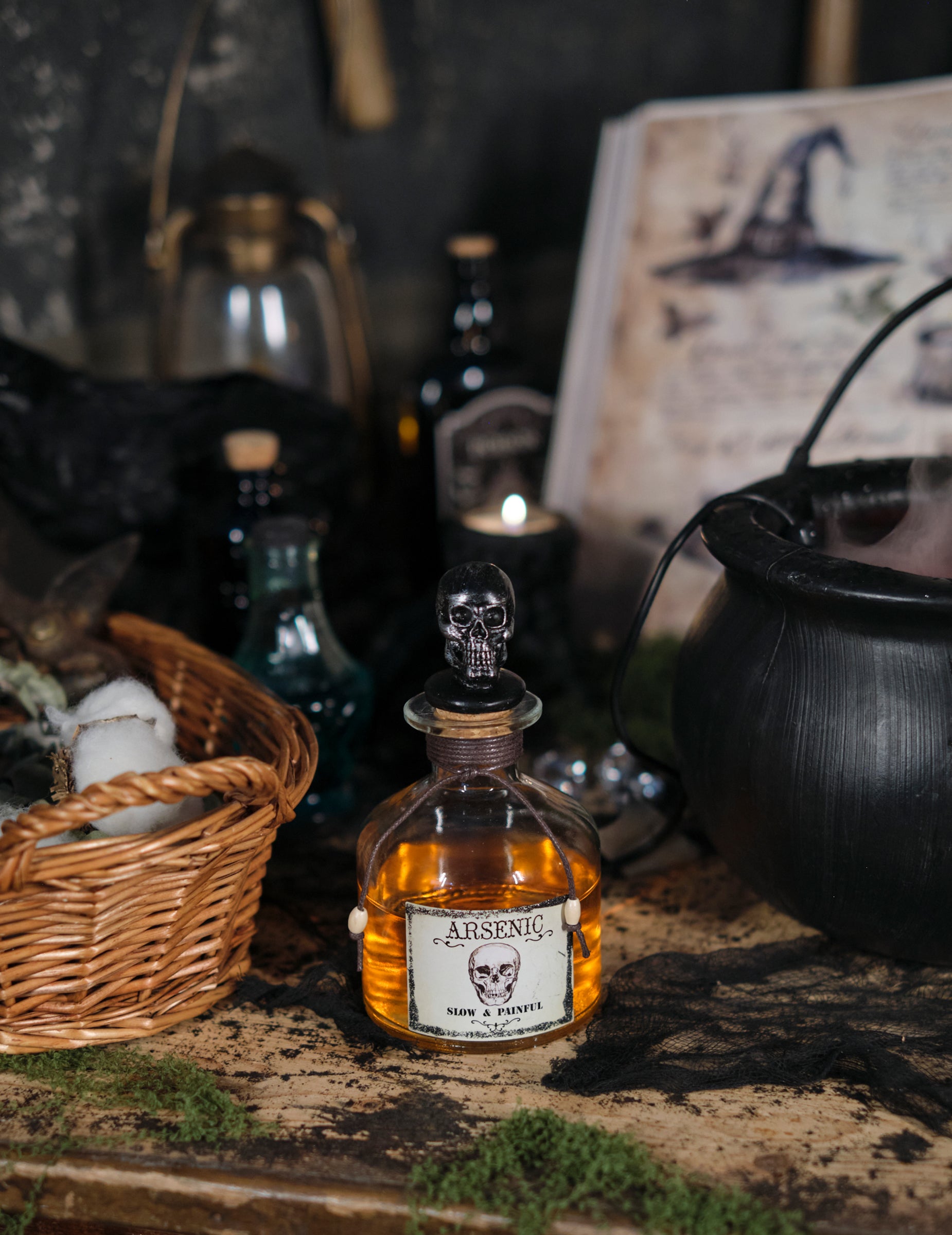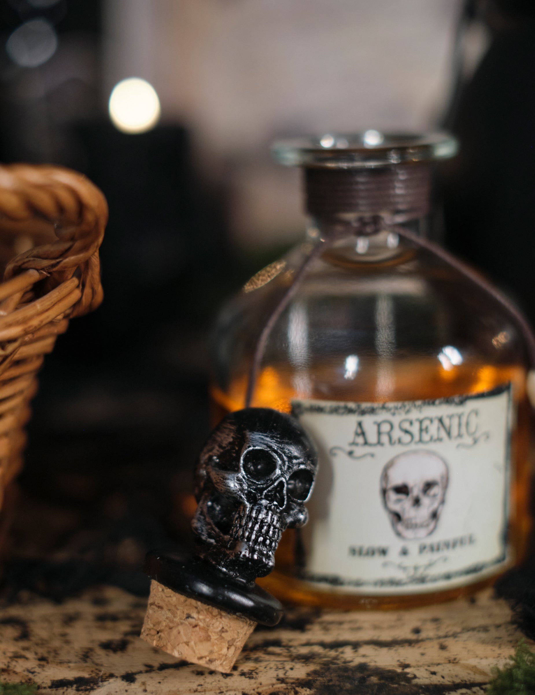 S 16 cm Visoka, ta viala ima grozljivo retro etiketo in izklesano kapo v obliki lobanje, ki poudarja njen moteč videz. Zaviti v vrv in opremljeno z majhnimi, premišljenimi detajli, odlično dopolnjuje dekoracijo, ki jo navdihujejo stare zastrupljene omare. Kot nalašč za obogatitev temne in privlačne nastavitve.