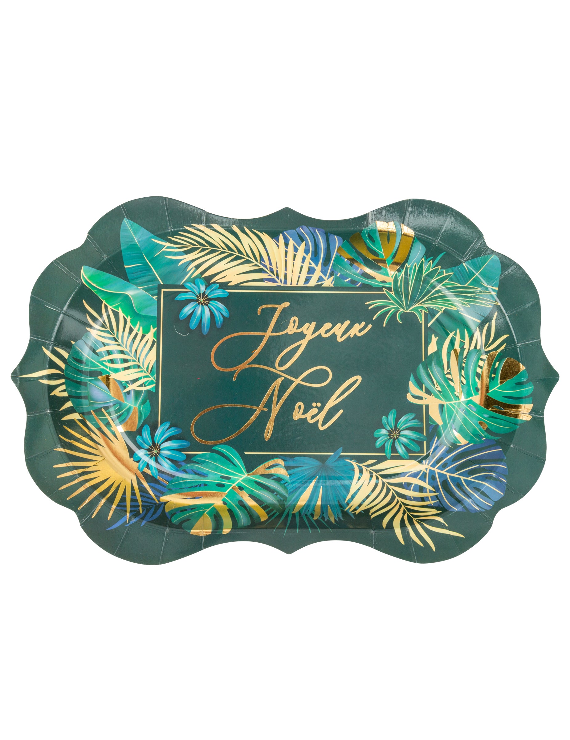 Ta sklop je sestavljen iz 8 krožniki Izdelano iz kakovostnega kartona. Z dimenzijami 31,5 x 19,5 cm, Imajo originalne izklesane robove. Okras vključuje napis " Vesel božič "V zlati barvi, obdani z elegantnim eksotičnim listjem v turkiznih in zlatih odtenkih. Ti krožniki so idealni za vzpostavitev teme." tropska džungla šik za vaše zabave Božič .