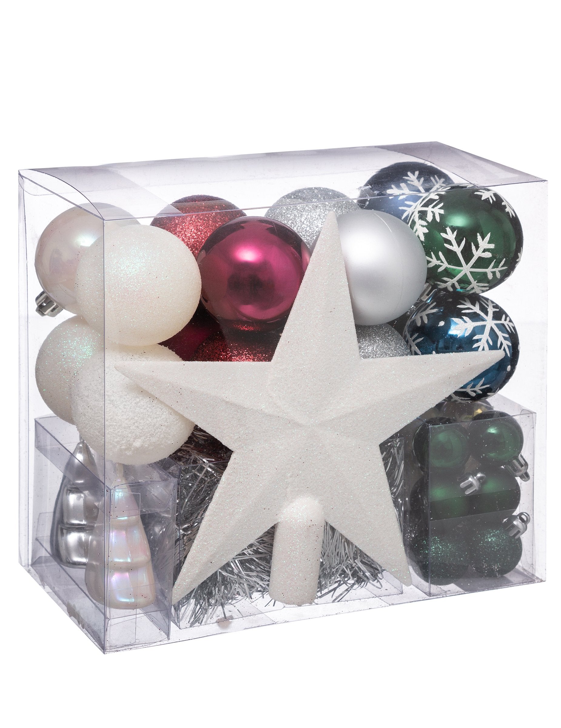 44-delni komplet za okrasitev božičnega drevesca v beli, rdeči, modri in zeleni barvi, vključno z kroglicami in okrasnim vrhom drevesca