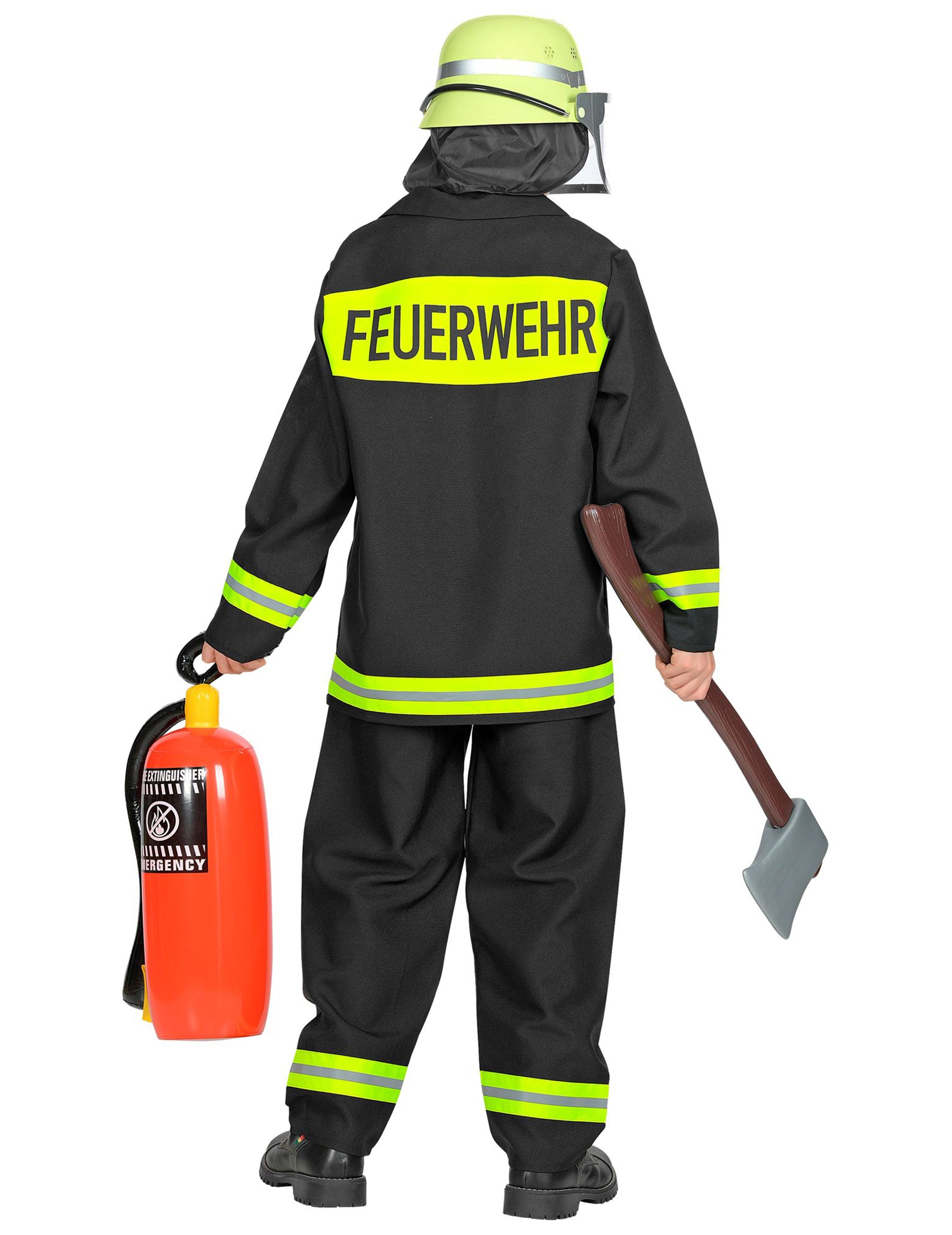 Črna majica ima rumene trakove. Na hrbtni strani tega kostuma boste našli napis "Feuerwehr" v nemščini.